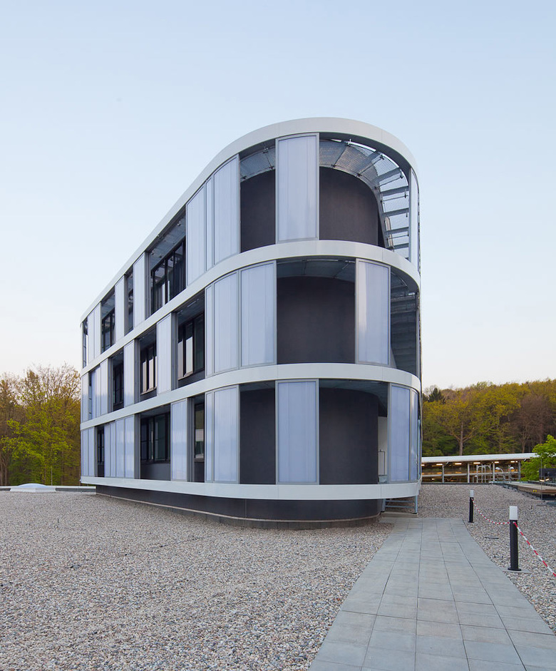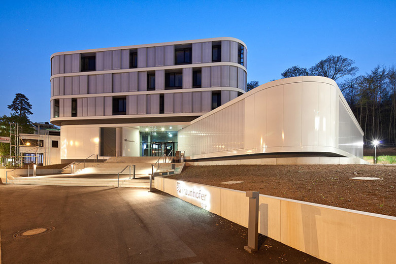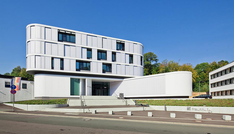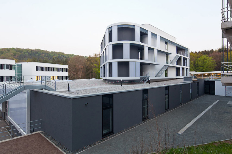 Erweiterungsbau des Instituts für Zerstörungsfreie Prüfverfahren in Saarbrücken um eine große Prüfhalle mit Technikum und Laborflächen, drei Büroetagen und einen großzügigen Eingangsbereich mit Konferenzraum
