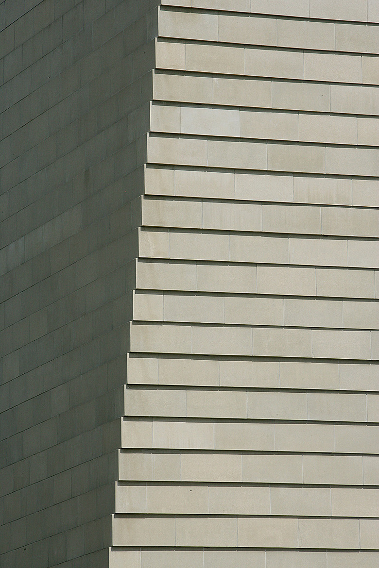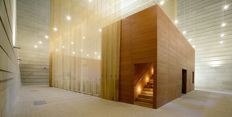 Besonderheiten und technische Innvoationen: Massive Hülle aus einem Baukastensystem von 3.200 Beton-Formsteinblöcken mit 140 unterschiedlichen Steintypen (1,20 m x 0,60 m x 0,60 m), Dach als Trägerrost, im Inneren die durchscheinende Hülle des Sakralraumes aus einem „gestrickten“ Messinggeflecht