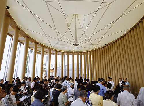This community center was built by church volunteers whose house of worship was destroyed by Kobe earthquake in 1995. Materials were donated by a number of companies, and construction was completed in only five weeks by the 160 volunteers. The plan(10 x 15m) is enclosed within a skin of corrugated, polycarbonate sheeting. Within this, 58 paper tubes (325mm in diameter, 14.8mm thick, and 5m high), were placed in an elliptical pattern. The eclipse is based on those in Bernini’s church designs, and the space between the eclipse and the outer edge of rectangular-shaped site formed a corridor and provided lateral support. At the entrance to the eclipse, the spacing of the paper tubes was widened, and the facade fully glazed to form a continuous, unified space between the interior and exterior.This church was disassembled in June 2005 and all the materials were sent to a city in Taiwan.