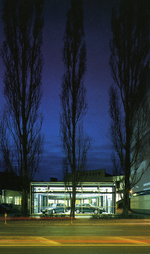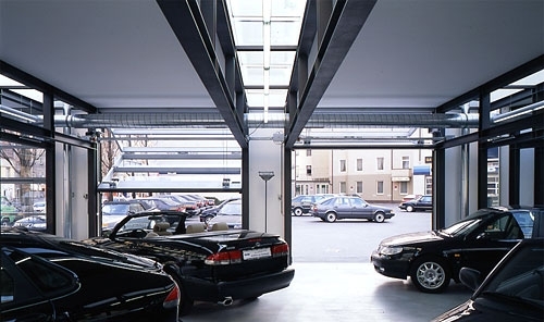 Die in der Innenstadt Münchens beengte Fläche eines Autohauses, erst Lancia, nunmehr Saab verlangte bei laufendem Betrieb nach einem Konzept hoher Vorfertigung sowie Montier- und Demontierbarkeit. Vierendeel-Tragwerksrahmen in Querrichtung, Holzscheiben als längsaussteifende Dachelemente sowie ein hoher Verglasungsanteil bilden das Grundkonzept. Besondere Aufmerksamkeit wurde der Entwicklung der Zugangs- und Zufahrtstore gewidmet.