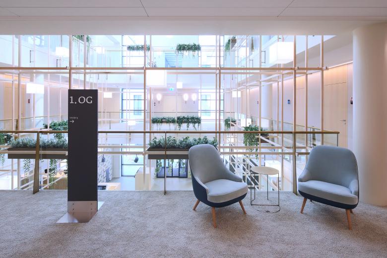Dem grossen Lichthof verleihen Lichtwürfel in Holzstrukturen einen Lichtkunstcharakter, welcher durch Bepflanzung einen Bezug zum Aussenraum erhält. Warme Farben und Materialien tragen zur ausgewogenen Stimmung bei, welche durch dezente, aber gezielt gesetzte Beleuchtung unterstrichen wird.