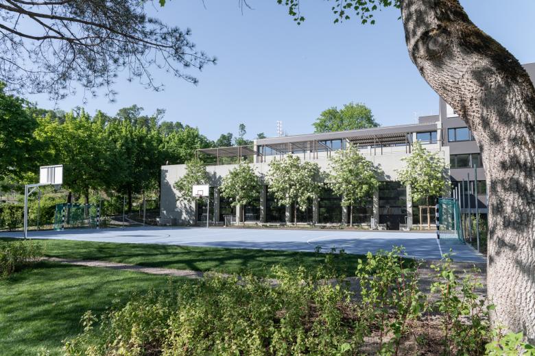 Im Zuge der Schulhaussanierung wird der Aussenraum basierend auf dem wertvollen Baumbestand grundlegend neu programmiert. Unterteilt in den räumlich gefassten Kindergartenaussenbereich mit Bachlauf und Ortbetonterrasse, die offene Schulterrasse mit neu projektierter Schattenpergola und den in den ausgelichteten Baumbestand eingelegten Spiel- und Sportflächen entsteht im grünen Herzen von Bettingen ein generationsübergreifender Ort der Begegnung.