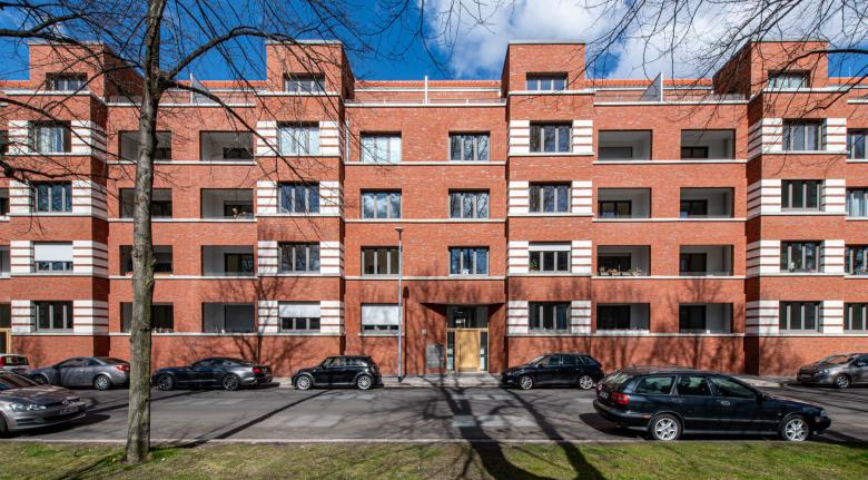 Eine Vorgartenzone an der Kommandanturstraße schafft den notwendigen Abstand zur Nachbarbebauung. Dem Leitmotiv des geschlossenen Ensembles folgend, bildet die Südwestecke einen turmartigen Baukörper aus. Dieser beherbergt die geförderten Wohnungen und fungiert städtebaulich als Entrée zum Stadtteil. Die Klinkerästhetik mit hell abgesetzten Eckverzierungen, das geneigte Dach und die Fassadengliederung greifen lokale Bautraditionen auf.