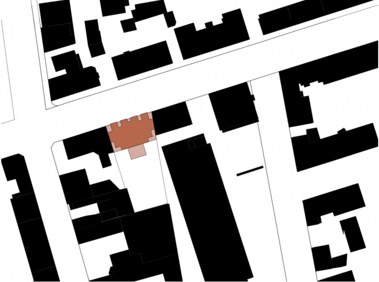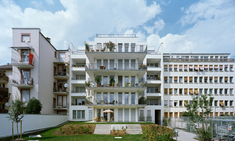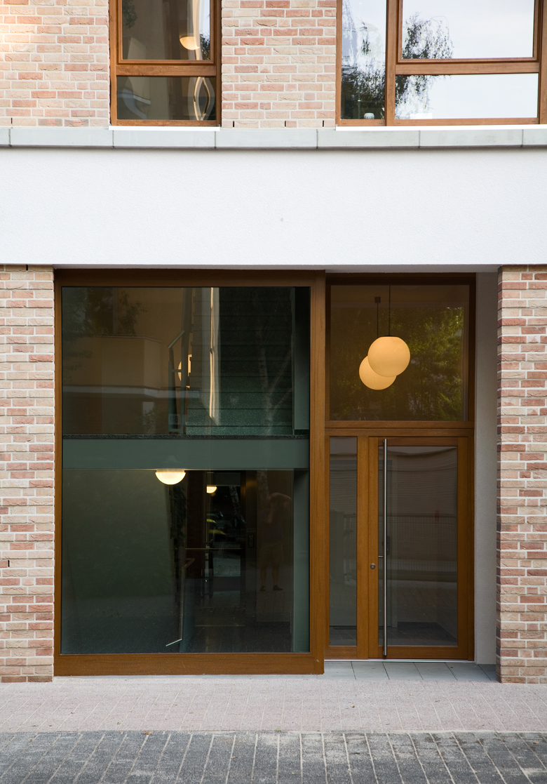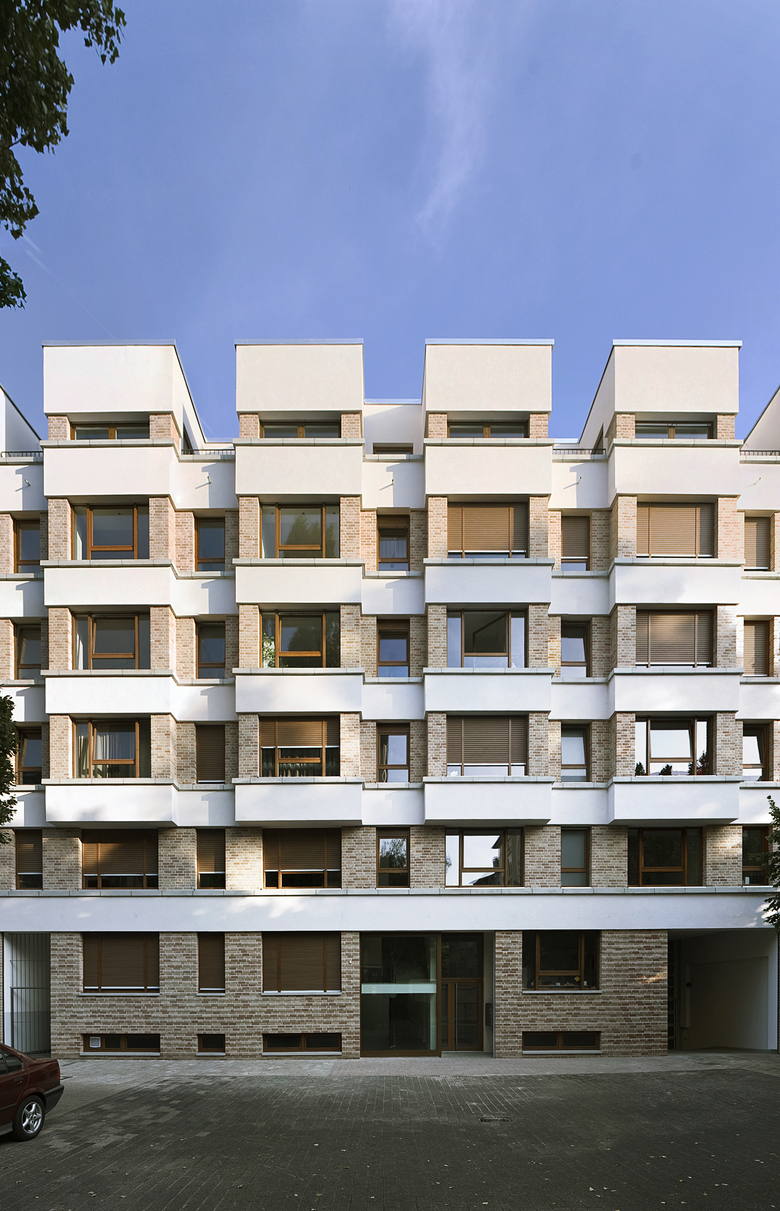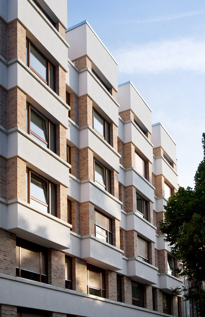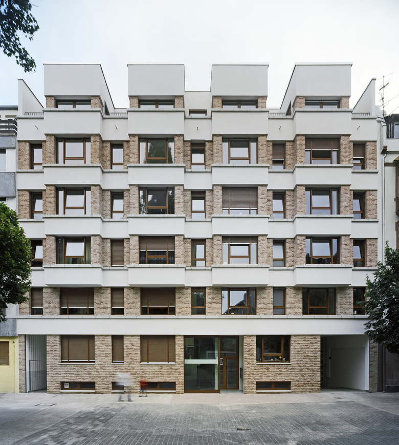 Das sechsgeschossige Wohnhaus im Frankfurter Ostend – auf dem früheren Grundstück einer Tankstelle gelegen – fügt sich sensibel in die Blockrandbebauung ein. Die Straßenfassade nimmt gezielt Anleihen am Expressionismus und bezieht sich mit ihren vier Erkern zugleich auf die Architektur der gründerzeitlichen Häuser in der Umgebung. Die vertikale Fassadengliederung wird durch den spannungsreichen Wechsel zwischen Klinkern und Werksteingesimsen horizontal gebrochen. Ein erhöhtes Erdgeschoss, die schmale seitliche Einfahrt und die großzügige Eingangssituation weisen das Gebäude als typisches Stadthaus im Blockrand aus. Im Unterschied zur Vorderseite greift die Hofseite Motive aus der Nachkriegsmoderne auf und reagiert damit auf die Nachbarbebauung: weit auskragende, U-förmig um einen zentralen Erker herum geführte Balkone mit filigranen Geländern werden von Loggien zu beiden Seiten flankiert. Im Inneren sind die Regelgeschosse als Vierspänner ausgelegt und ermöglichen eine Vielzahl an unterschiedlichen Wohnungszuschnitten und Grundrisstypen.