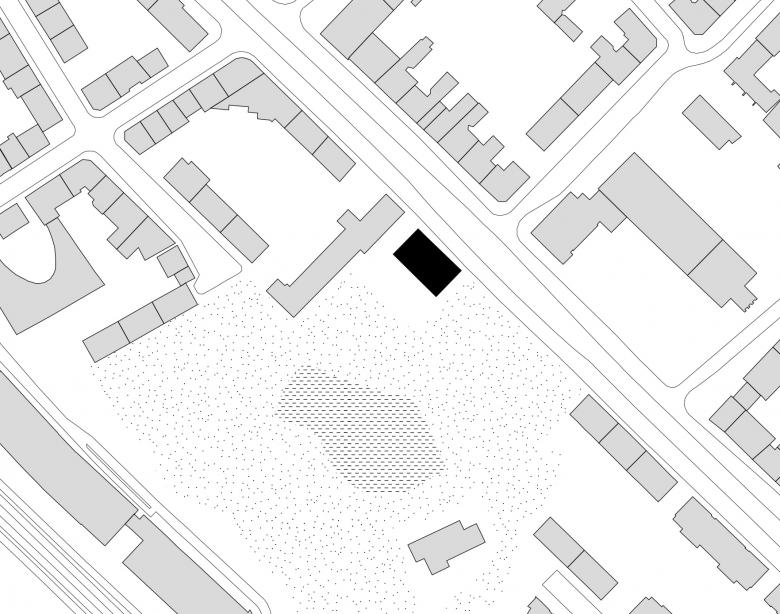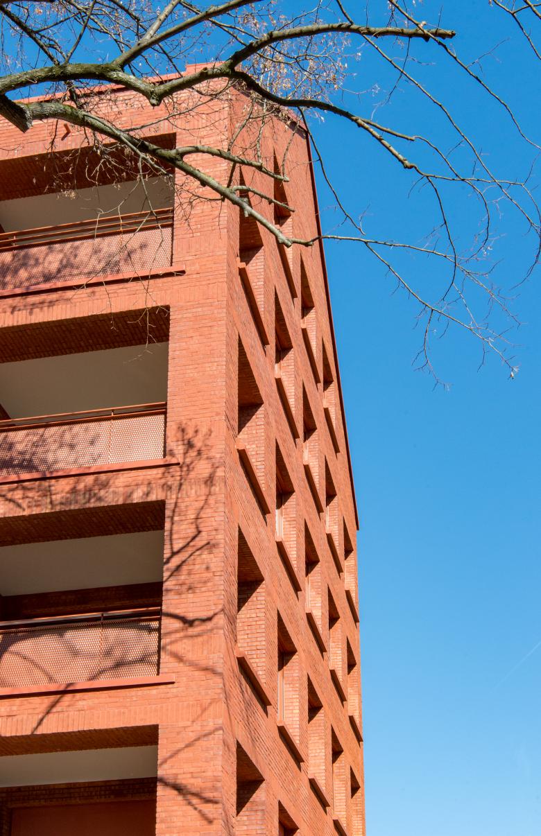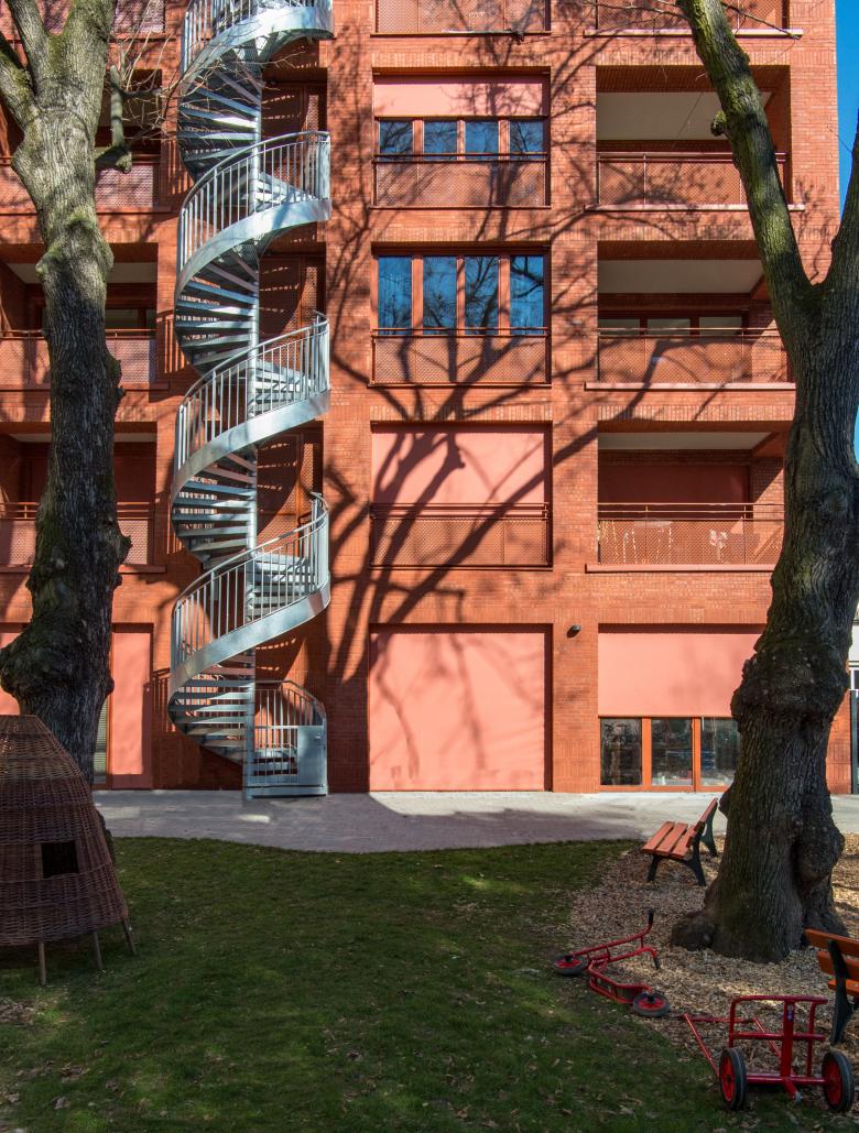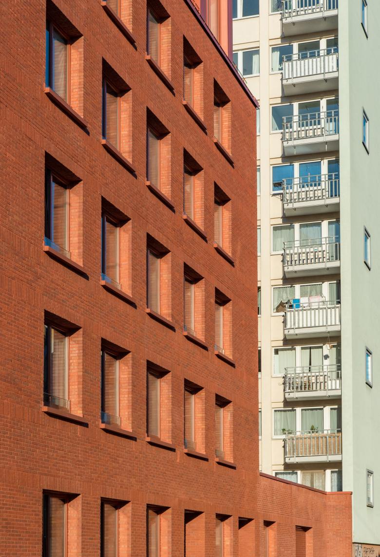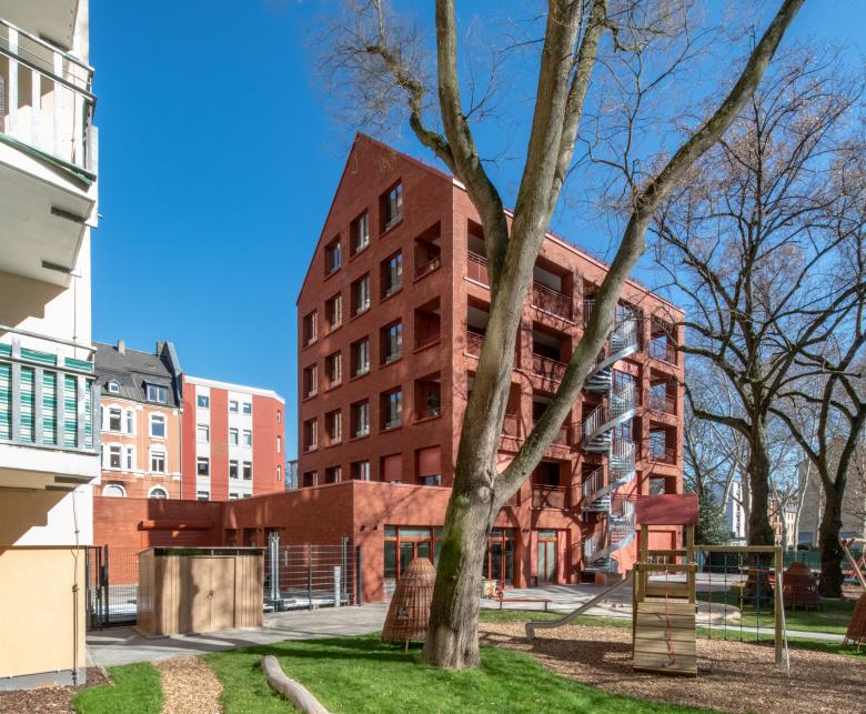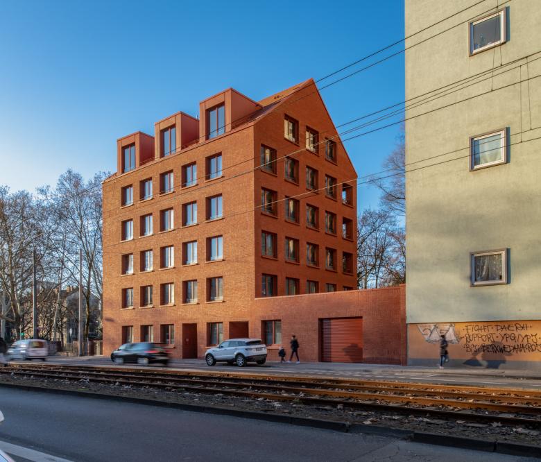 Das fünfgeschossige Wohnhaus mit Dachgeschoss an der Schloßstraße in Frankfurt-Bockenheim ersetzt einen überwiegend gastronomisch genutzten Flachbau. Es bietet Raum für 13 Wohnungen und eine Kita mit angeschlossenen Geschäftsräumen im Erdgeschoss und erstem Obergeschoss. Das Haus reagiert auf die städtebauliche Situation zwischen der Straße im Norden und dem Von-Bernus-Park im Süden. Der Baukörper greift die Bebauungs- und Trauflinie des Kontexts auf und fügt sich mit dem (traufständigen) Satteldach selbstverständlich ein. Reduzierte Lochfassaden gliedern die Straßen- und Giebelseiten, während sich die Rückseite mit bodentiefen Fenstern und Loggien zum KiTa-Garten und dem Park, dessen Eingang direkt an das Grundstück anschließt, hin öffnet. Mit ihrer monochromen Farbigkeit erscheint die rote Klinkerfassade einerseits vertraut und wohnlich, andererseits entsteht ein markanter Kontrapunkt zur gesichtslosen Wohnbebauung der 1960er-Jahre.