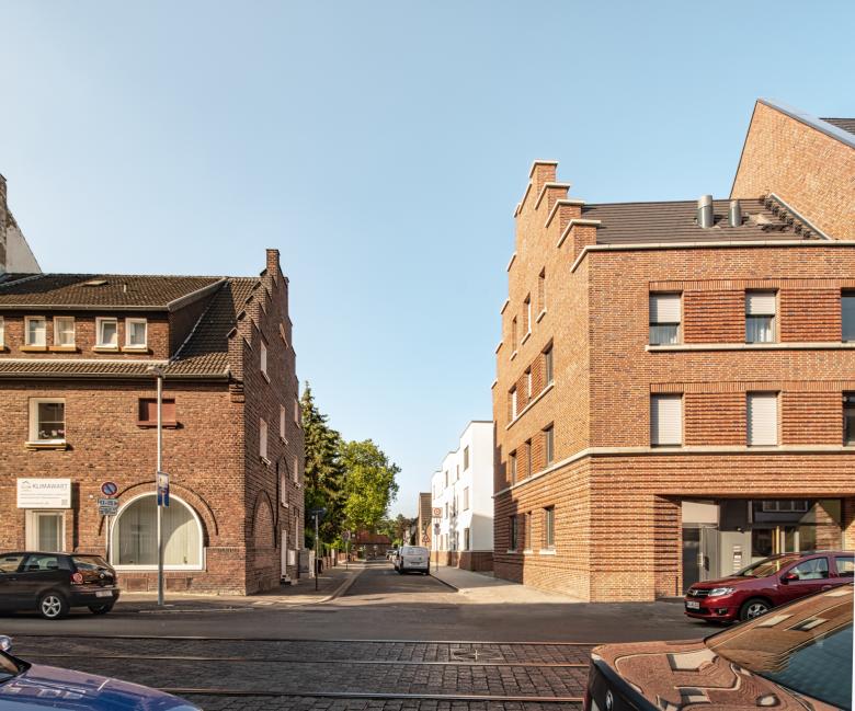 Der Neubau des Gebäudeensembles orientiert sich in seiner Form und Materialität am vormaligen Bestandsgebäude. Mit seiner differenzierten Höhenentwicklung, die zwischen drei und fünf Vollgeschossen variiert, dem langgestreckten Satteldach und den Treppengiebeln an den niedrigeren Kopfseiten reagiert der Baukörper auf die unterschiedlichen Dimensionen des städtischen Kontexts. Die Fassade ist über die gesamte Länge mit Risaliten und Erkern gegliedert und rhythmisiert. Versetzt angeordnete Klinkerlagen im Sockelbereich und die Grenadierschicht über den Fenstern unterstreichen die Plastizität der Fassade. Die Eingänge an der Straße befinden sich jeweils unter den Vorsprüngen der Erker, sind leicht zurückversetzt und durch eine schräge Wandfläche betont. Nach Süden wird das Haupthaus entlang beider Seiten um zwei separate Wohnhäuser ergänzt. Der Klinkersockel stellt die Verbindung zum Haupthaus her. Insgesamt entstehen 62 Genossenschaftswohnungen.