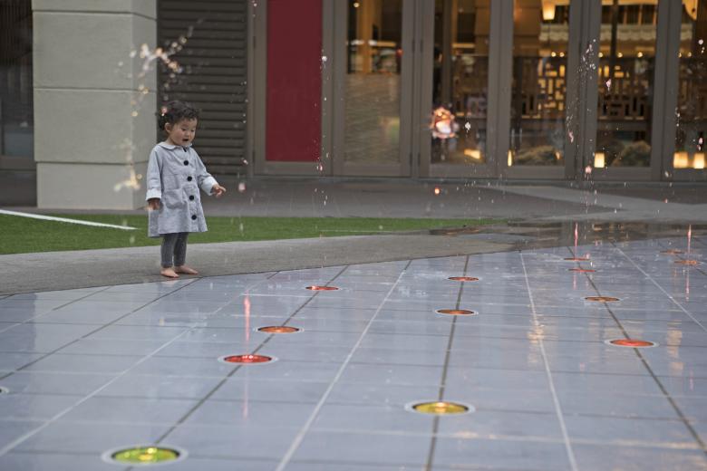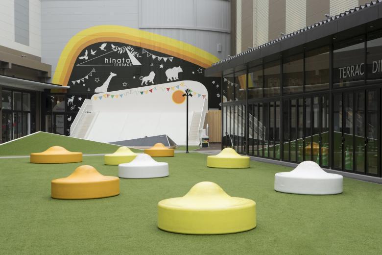 Sections of the lawn are raised at an angle like a mound, and they can be used for people to stretch out and relax, or to view various activities inside and outside of the stores.