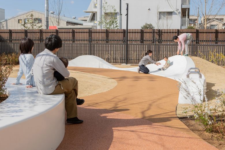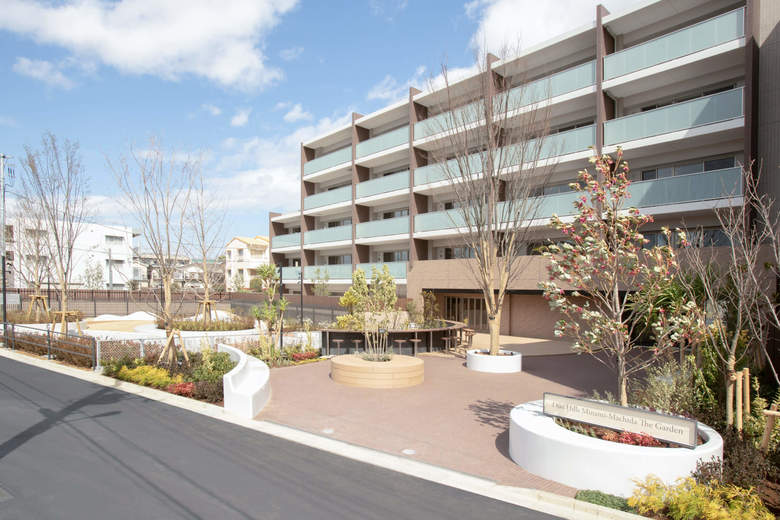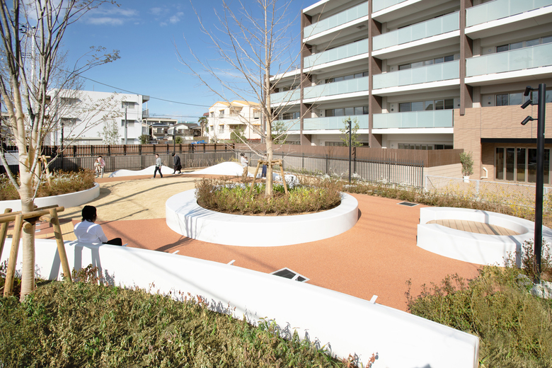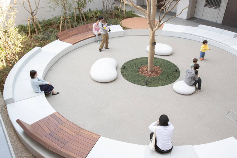 Duo Hills Minami-Machida THE GARDEN is situated near Minami-Machida Station, which has become a popular area due to recent developments, including the construction of large-scale commercial facilities near the station. Many people have moved to this area and a new community is growing. Our concept for the landscape design was "circles that bond," and we placed many features that allow activities within the garden to be visible and ready for interaction. In doing so, we hoped to make a new addition to what the town has to offer. Inside we created three areas: the entrance approach, an inner circular garden that functions as a communal space, and the "arena garden" public area. We placed a large ring of sofas in the inner circular garden that allows people to sit facing each other while enjoying natural elements. In the entrance approach and the arena garden we used a design that incorporates various linked spaces with circular motifs that join the residents with people who live in the wider area. Our idea was that these spaces would work as a bond between the different groups.