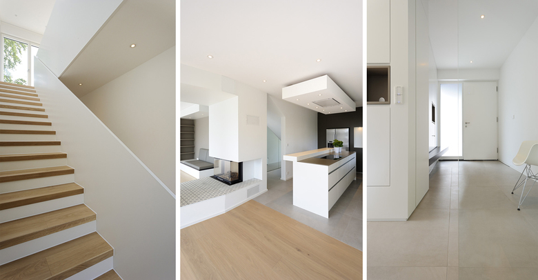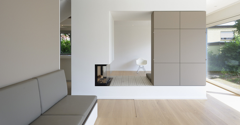 Präzise gesetzte Einbaumöbel integrieren unterschiedlichste Funktionen wie die Garderobe, das Sofa, das Bücherregal, den Kaminofen und den Fernseher. Gleichzeitig zonieren die wie aus einem Guss wirkenden Einbauten sowohl den Eingangs- als auch den Wohn- und Essbereich, der sich über eine raumhohe Verglasung zum Garten orientiert. Das Ensemble aus Kaminofen