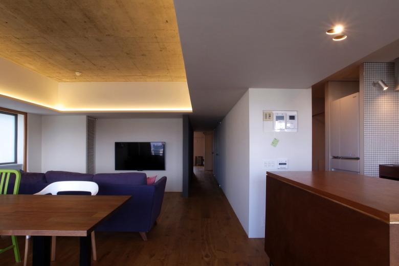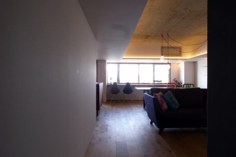 具体的には、玄関の風除区画を変更し、いくつかの建具を外すことで、いままでは見えていなかった18mの奥行きを露にし、見通しをつくり、