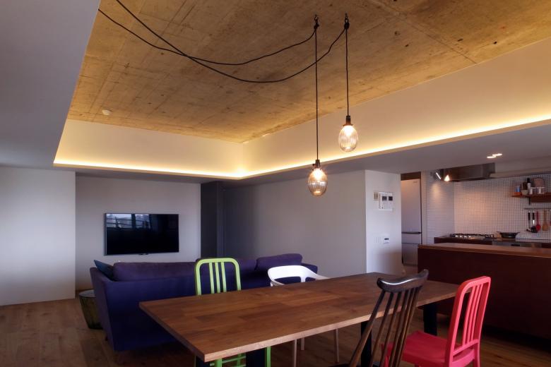 天井を無くすことの出来る箇所は大きく解体し、既存躯体のコンクリートを現しとして天上高さ2.5mの大空間を確保している。