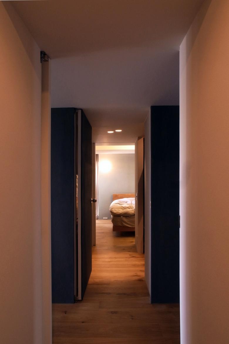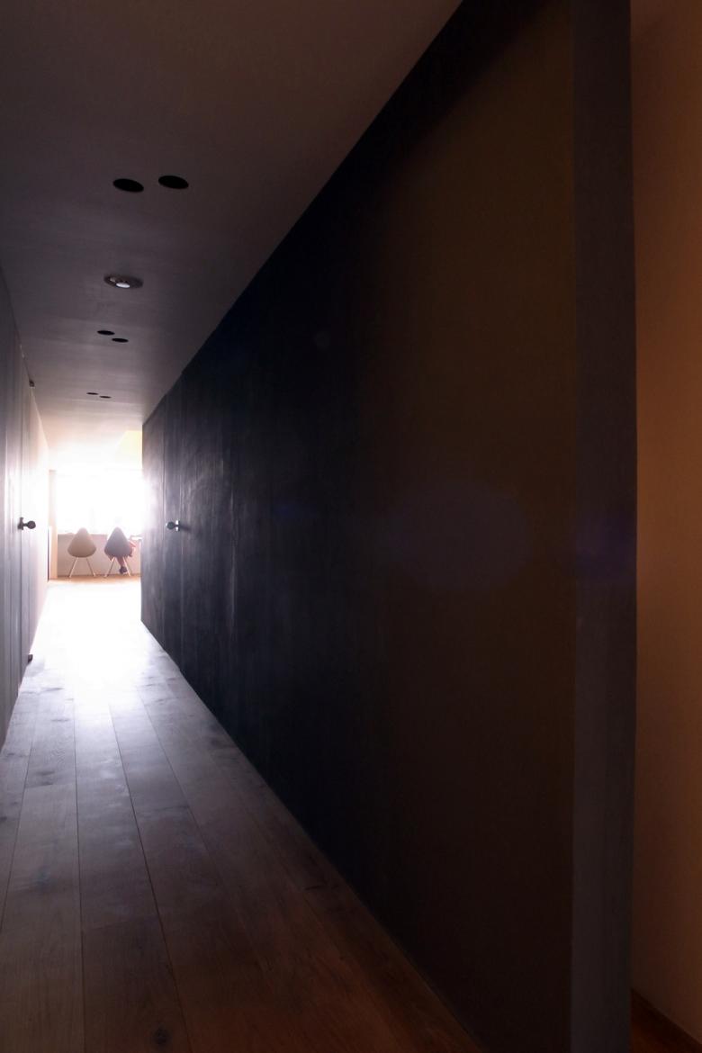 両端の窓からの光と風を繋ぎ、更にその長い廊下空間に黒漆喰を仕上げて、調湿機能を持たせる事で家全体の気候を快適にする役割を担わせている。