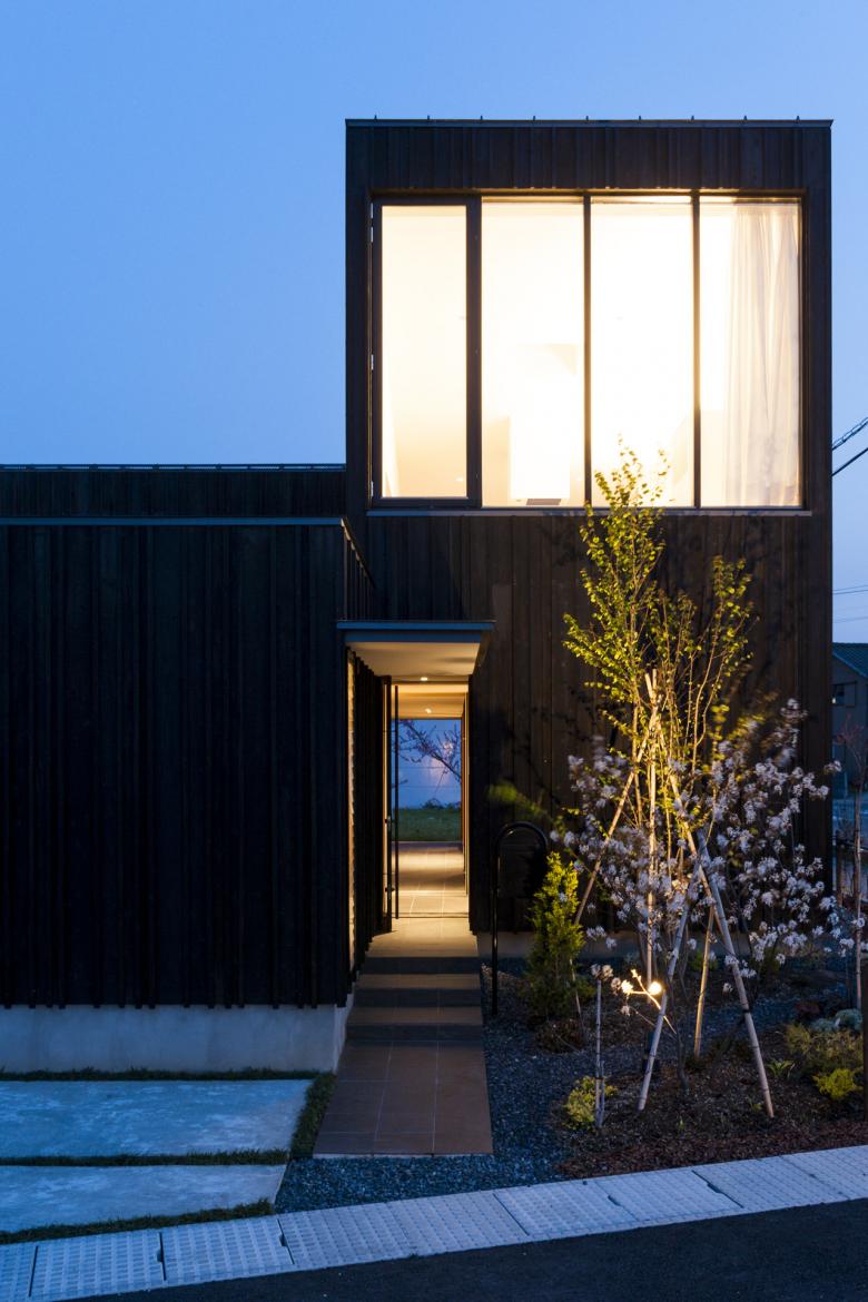地域との接点となる外壁にもこの地域の環境を取り込みたいと考えた。焼杉板を縦張りとし、目地に押縁を付ける。焼杉板は幅の異なる4種類の板を規則的に張付け、そして目地には厚さの異なる3種類の押縁を規則的に取り付けた。それにより出来る外壁のランダムに見える凹凸は陽射しを受けて刻々と変化する陰影を生み、また冬には焼杉の凹凸に雪が吹き付き、雪の白と焼杉の黒が豊かな文様を描き出している。前面の県道は近くの小学校に通う子供達の通学路となっており、朝と夕方で異なる表情をみせるこの壁を、子供達は今日も指差し押縁の数を数えている。