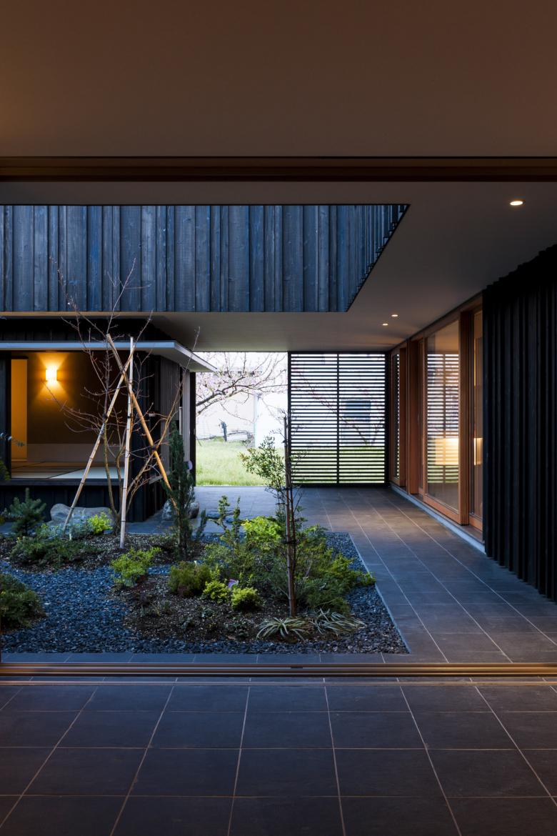 複数の棟を生け垣で囲い込み1つの屋敷構えとしている周辺の農村集落の建物の建ち方を取り入れ、桃畑に茶室、ウォークインクローゼット、子供室を別棟として配置しそれにより、敷地を緩やかに囲い込むことで外部との関係を保ちつつ、適度な距離をとった中庭を計画した。3個の別棟に大きな2階のボリュームを載せ、それにより出来た隙間に茶室への露地や玄関土間、寝室、書斎といったスペースを、内外の環境が曖昧なままに配置している。