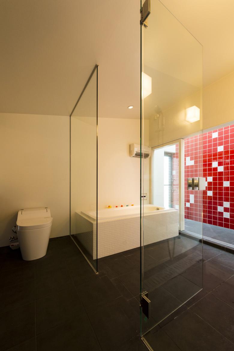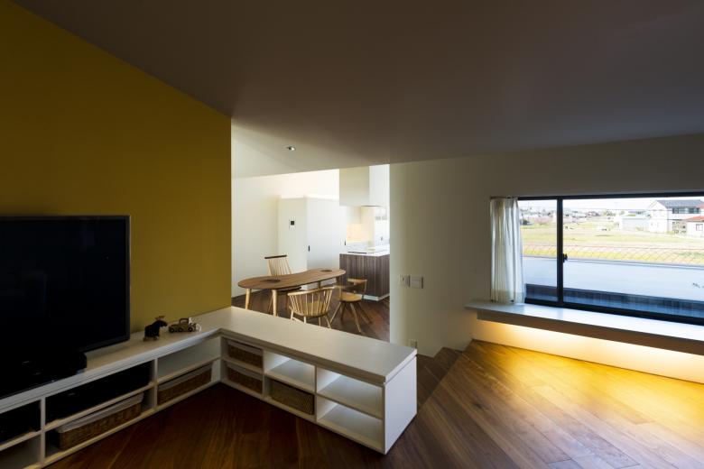 玄関土間より上がる2階にはLDKとバスルームを配置。地上レベルではバラバラに見えていた色々な環境。
