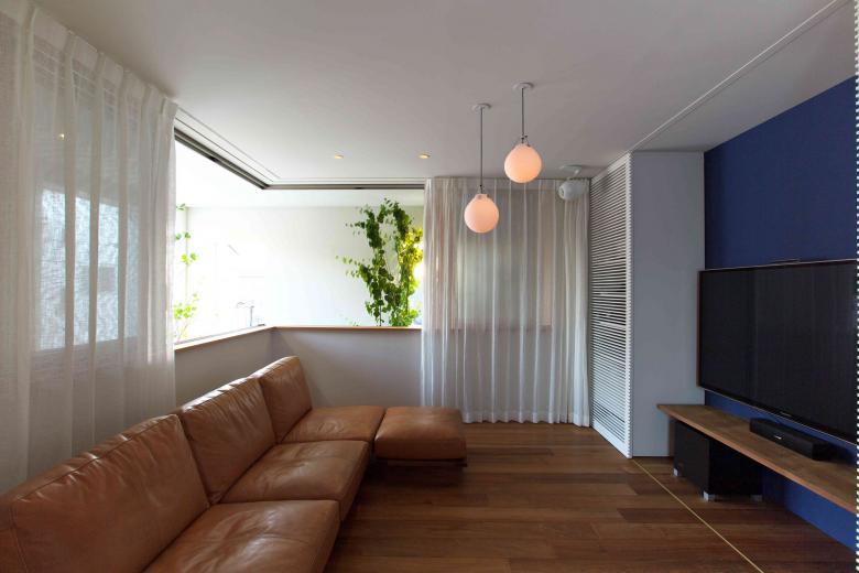 2階に配置されたLとDとKの外部には2Fまで届く背の高い樹木が沢山植えられ「廻庭」を形成している。「廻庭」に面して大きな窓を開ける事で、豊かに生い茂る木々に包まれた、木々に触れられる開放的な生活を可能にしている。