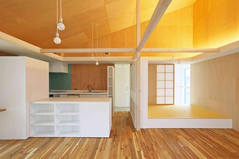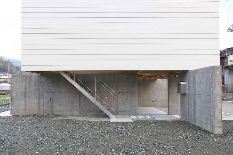 敷地周辺の住宅の建ち方に習い高床式住居とし、生活スペースを地上から上空に持ち上げた。クライアント夫妻の希望するライフスタイルや屋外との関係の作り方といった、