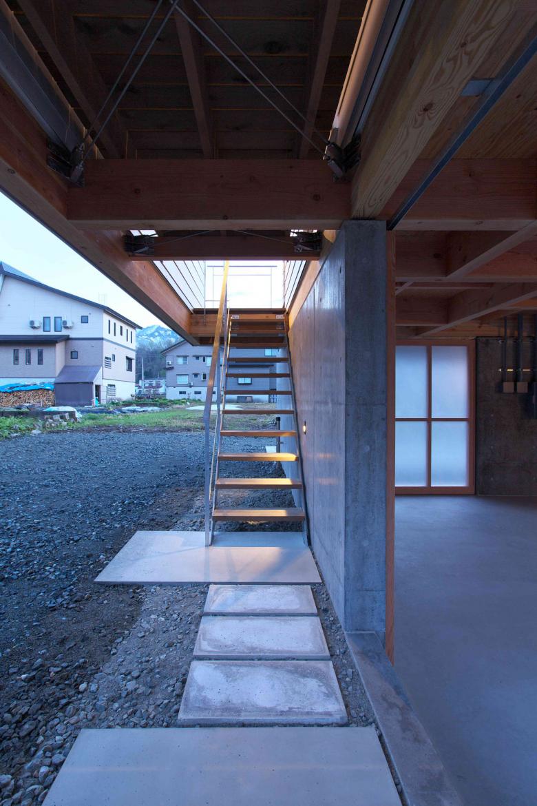 地域慣例に基づく「特別豪雪地帯における高床式住宅の特例」を最大限運用し、壁式RC造の高基礎の上に、RCスラブではなく木格子による床板をつくり、