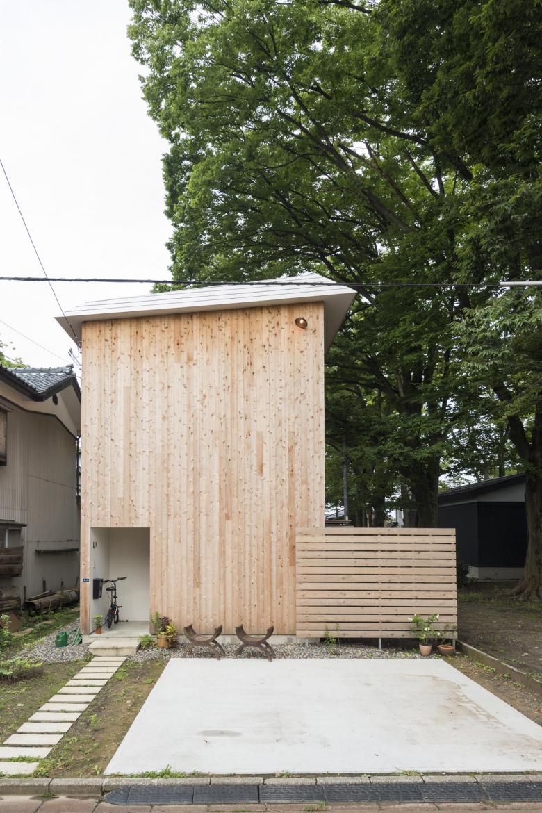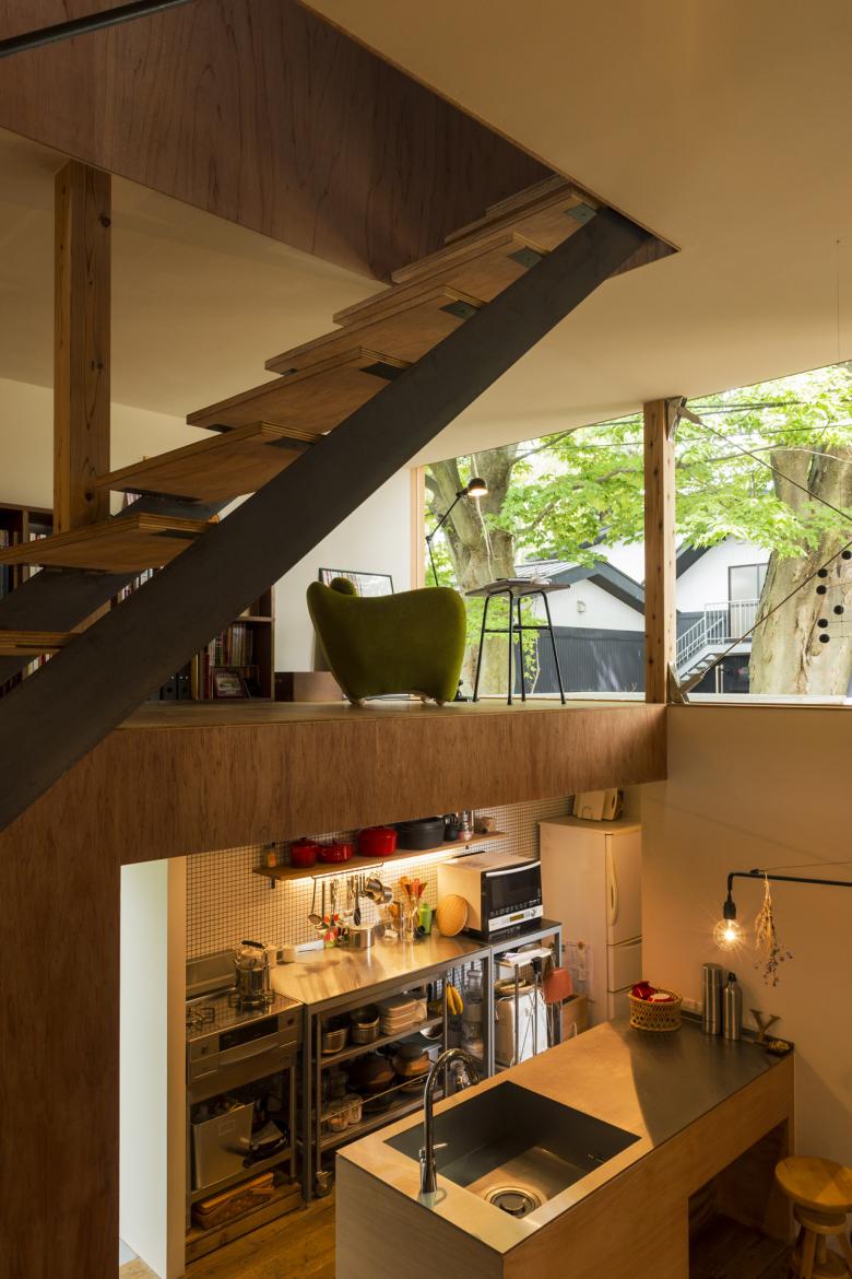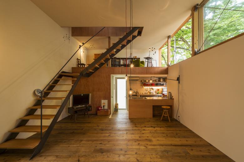 また、外壁には無垢のベイスギを使用し、床には古材の杉足場板、階段は黒皮鉄とラワン、素材をそのままに扱い、年月を経て変わっていくことを受け入れ、竣工時が完成ではない、クライアントのライフスタイルや四季の有り様、時間の経過とともに「変化していく家」が目指されている。
