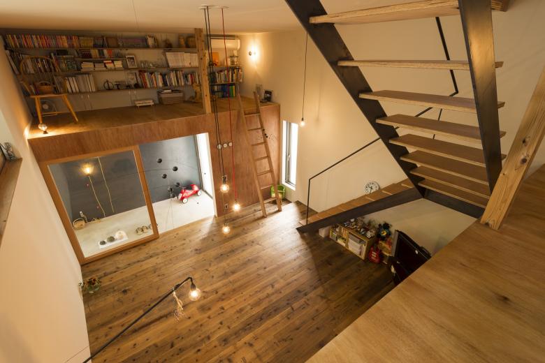 リビングの両端には階段の踊り場ともなるロフト空間を配置し、その先には大ケヤキに直接触れられるテラスを配置している。