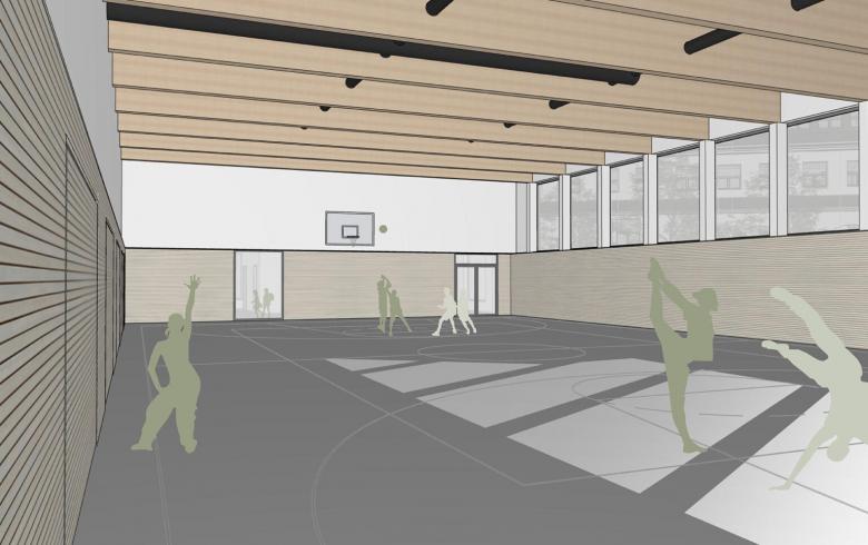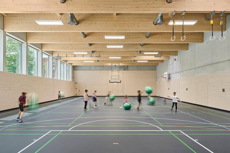 Ein saniertes Treppenhaus und neue Fluchtwege ergänzen die Gebäude funktional. Die neue Sporthalle mit begrüntem Dach, Klinkerfassade und Holztragwerk verbindet Nachhaltigkeit mit ansprechendem Design. Eine Photovoltaikanlage sowie eine mit Holzpellets betriebene Quartiersheizzentrale versorgen Schule und umliegende Gebäude mit erneuerbarer Energie. Das Gebäude dient sowohl als Sportstätte als auch als energetisches Herzstück des Quartiers.