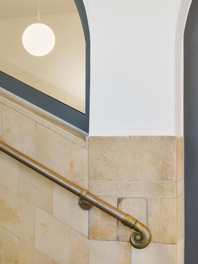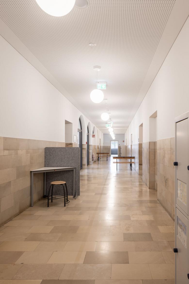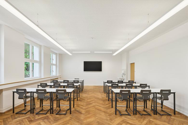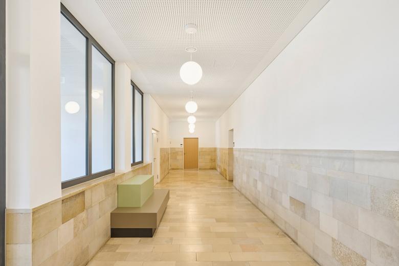 Durch die Sanierung und Erweiterung des Schulensembles entstand eine moderne, zukunftsorientierte Ganztagsgrundschule für rund 200 Kinder. Das Ensemble umfasst drei Gebäude: ein kleines Schulhaus von 1877 und ein größeres von 1927 – beide denkmalgeschützt – sowie den Neubau einer Einfeld-Sporthalle. Die Sanierung zeigt, wie sich historischer Bestand und heutige Anforderungen verbinden lassen. Neue Böden, Akustikdecken, Brandschutzmaßnahmen und barrierefreie Zugänge modernisieren die Schulhäuser – ergänzt durch zeitgemäße Möblierung und digitale Infrastruktur. Mit großer Sorgfalt wurden originale Elemente wie Fischgrätparkett, Rundbögen und Sandsteinflächen erhalten und restauriert.