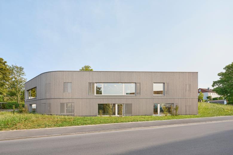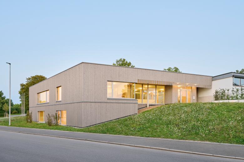 Die Bestandsgebäude, zwei kubische Baukörper aus gelblichem Stein und einem weiß gestrichenen Mittelteil aus den 1950er-Jahren, wurden bei laufendem Kita-Betrieb in Teilen saniert und umgebaut. Gemeinsam mit dem Neubau bilden sie einen geschützten Innenhof, der als abgeschirmter und sicherer Spielplatz für die U3-Kinder dient. Der neue Erweiterungsbau hebt sich bewusst von der Bestandsarchitektur ab und überzeugt mit einer geschwungenen Fassade aus vertikalen, vorvergrauten Holzpaneelen. Diese Lamellenstruktur reflektiert die natürliche Hanglage und erzeugt je nach Blickwinkel eine veränderliche Fassadengestaltung. Sie dient nicht nur als gestalterisches Element, sondern den Kindern auch als dezente und zugleich wirkungsvolle Absturzsicherung der großzügigen Fensterflächen der Gruppenräume. Die insgesamt gestaffelte Gebäudehöhe bewahrt die bestehende Struktur der Kita-Anlage und fügt sich sanft in die Hanglage ein.