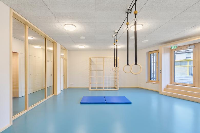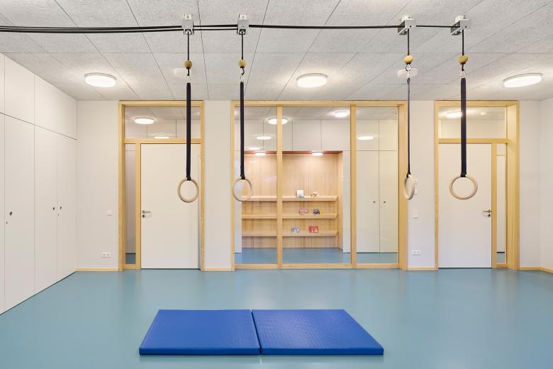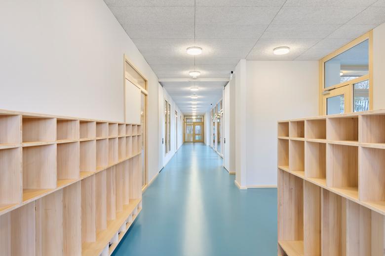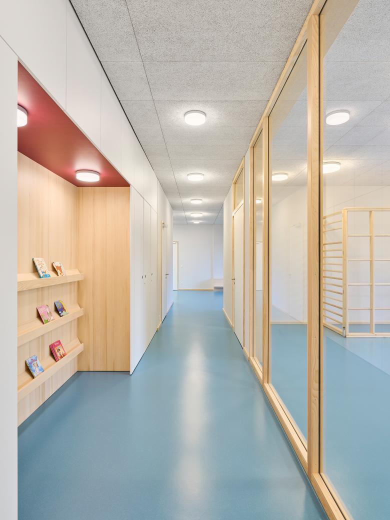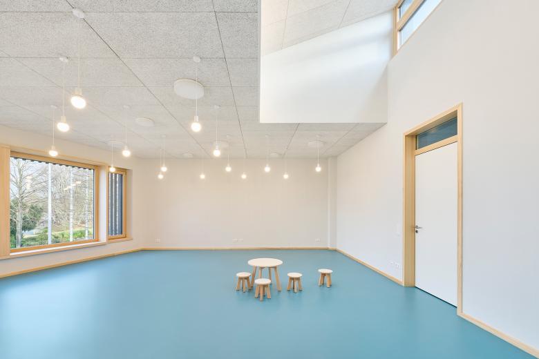 Im Gebäude setzen warme Holztöne, weiße Oberflächen, helle Wände und Decken sowie klare Sichtbetonflächen Akzente und schaffen eine freundliche Lern- und Spielumgebung. Das markante Türkis des robusten Kautschukbodens zieht sich als lebendiger Farbton durch das gesamte Gebäude und schließt auch die Treppenanlage ein. Die einzelnen Materialien fügen sich harmonisch zu einem stimmigen Materialkonzept zusammen und vermitteln einen schlichten und zurückhaltenden Gesamteindruck, den die Kinder lebendig und bunt bespielen. Akustikdeckenplatten aus Holzwolle dämpfen den Schall und schaffen eine angenehme Raumakustik. Ein durchdachtes Lichtkonzept kombiniert Pendel- und Scheibenleuchten mit individuell steuerbaren Lichtbändern, die verschiedene Beleuchtungsszenarien ermöglichen.