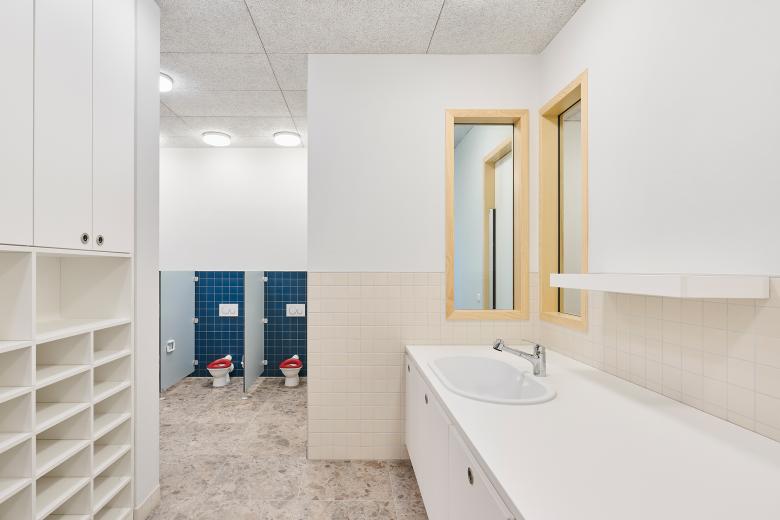 Die Kinder und Betreuenden der Kita bewegen sich durch helle Flure und Spielflure, die kindgerecht gestaltet sind und sich auch als Bobby-Car-Rennbahnen nutzen lassen. Eine neue Treppenanlage und ein Aufzug verbinden das Erdgeschoss mit dem Sockelgeschoss. Hier befinden sich ein Bewegungsraum mit Sportgeräten, eine gemütliche Kinderbibliothek, ein großzügiger Essbereich mit Verpflegungsküche sowie ein Aufenthaltsraum für die Betreuungskräfte. Der Essraum zeichnet sich durch große Fenster und Sitzstufenmöbel aus, die eine einladende und kindgerechte Atmosphäre schaffen. Im Bewegungsraum dient eine großzügige Holztreppe gleichzeitig als Tribüne, während ein großes Fenster für viel Tageslicht sorgt – beide Elemente fungieren zudem als Fluchtweg. Mit ihrer kleinen Leseecke lädt die angrenzende Kinderbibliothek zum Verweilen ein.