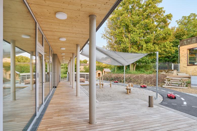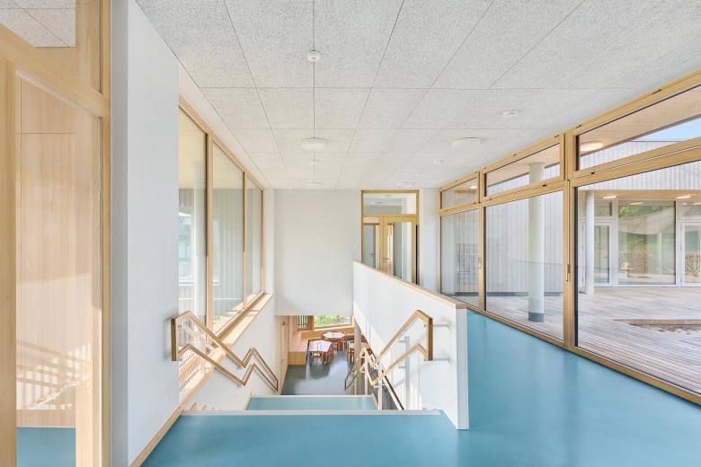 Betritt man den Neubau, so fällt die großzügige Raumgestaltung ins Auge. Hohe Decken und weitläufige Fensterfronten lassen viel Tageslicht in die Flur-, Gruppen- und Spielbereiche und fördern eine offene und kommunikative Atmosphäre. Große Glasflächen schaffen fließende Übergänge zwischen Innen- und Außenraum und bieten spannende Blickbeziehungen zur umgebenden Natur. Alle Gruppenräume im oberen Geschoss sind nach Norden ausgerichtet, während Oberlichter Licht aus dem Süden einfangen und zusätzliche Helligkeit bieten. Ein Erschließungsflur samt Schmutzschleuse verbindet die Gruppenräume mit dem nach Süden ausgerichteten Innenhof, der mit seiner überdachten Terrasse und einem U3-gerechten Spielbereich für die Kleinsten ausgebildet ist.