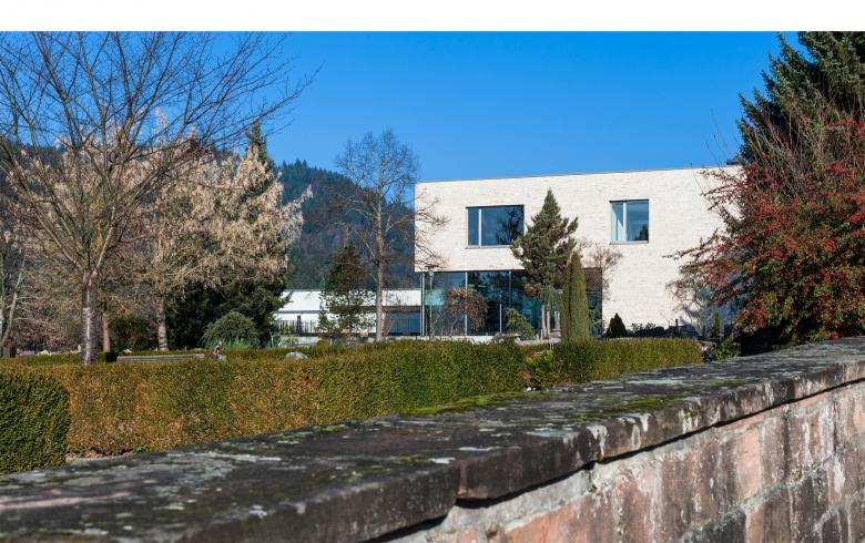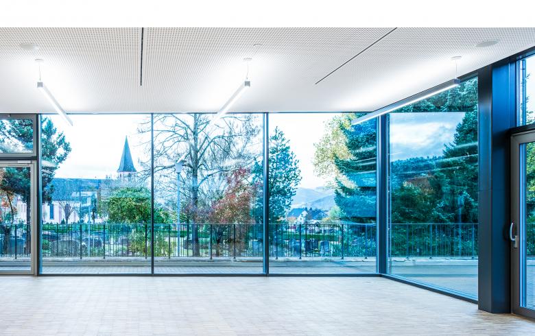 Der 2-geschossige Neubau mit Mensa, Vollküche und Räumen für Unterricht und Selbstlernen vervollständigt das Gesamtensemble des Schulzentrums und positioniert sich als gut sichtbarer „Drehpunkt“ zwischen dem Bestand der 1-4 geschossigen Gebäudekuben. Im Obergeschoss ist der Aufenthalts- und Lernbereich untergebracht, geschützt vom Lärm des neuen Pausenhofs und der Mensa im EG. Im Untergeschoss befindet sich, neben den Sanitär- und Nebenräumen, die Anbindung an die bestehende Veranstaltungshalle. Durch diese Anbindung kann die Veranstaltungshalle barrierefrei von der Haupterschließungsseite, der Kirchstraße, erfolgen. Als Material kommt bei der Außenfassade ein Verblendmauerwerk zur Anwendung. Durch die Kompaktheit des Baukörpers verbleibt im Westen eine große Terrassenfreifläche mit Ausblick auf die angrenzenden Wälder.