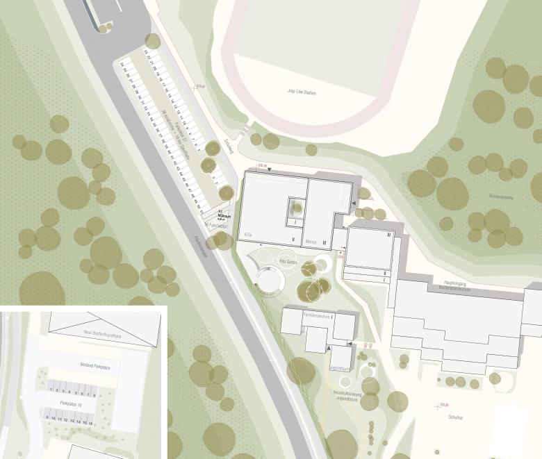 Das Verkehrskonzept sieht eine Neuordnung der Parkplätze und eine sichere Verkehrsführung für Radfahrer, Fußgänger und Fahrzeuge vor. Zudem wird die Anzahl der Stellplätze auf dem Gelände deutlich erhöht. Ergänzend dazu wird ein nachhaltiges Energiekonzept verfolgt, das auf eine hochwärmegedämmte Gebäudehülle, Photovoltaikmodule und die Anbindung an die Nahwärmeversorgung setzt.