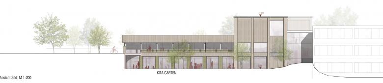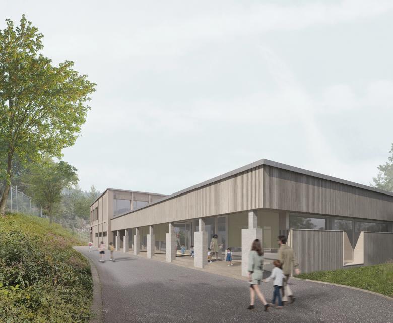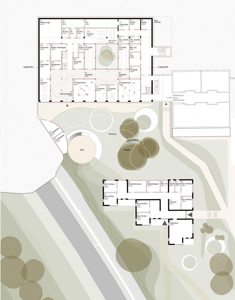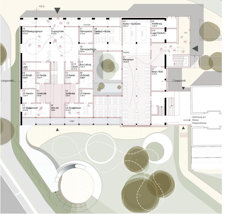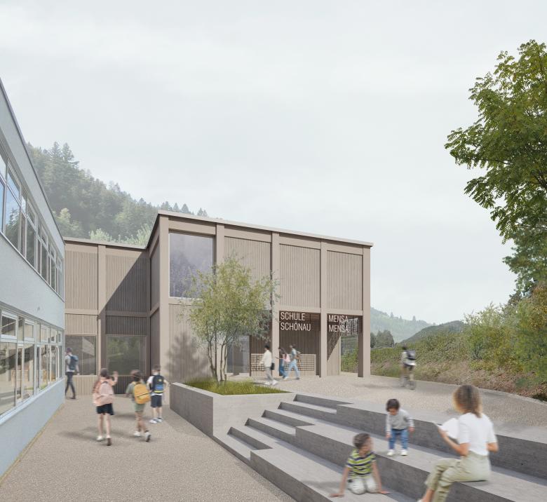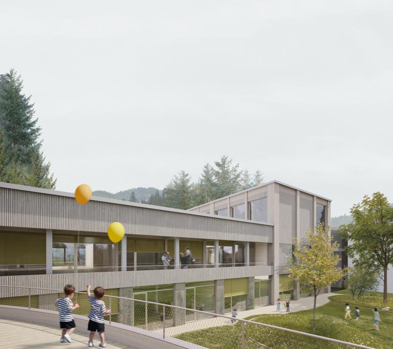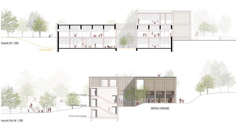 Die Mensa wird zentral zwischen der Schule und dem Kindergarten positioniert, um als gemeinsamer Treffpunkt zu dienen. Der Schulbereich wird durch vier neue Klassenräume im Obergeschoss erweitert, die in Leichtbauweise auf die bestehende Struktur aufgesetzt werden. Eine gläserne Treppen- und Liftanlage verbindet alle Ebenen barrierefrei.