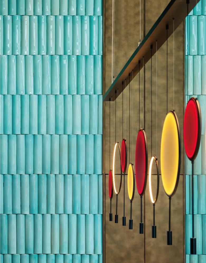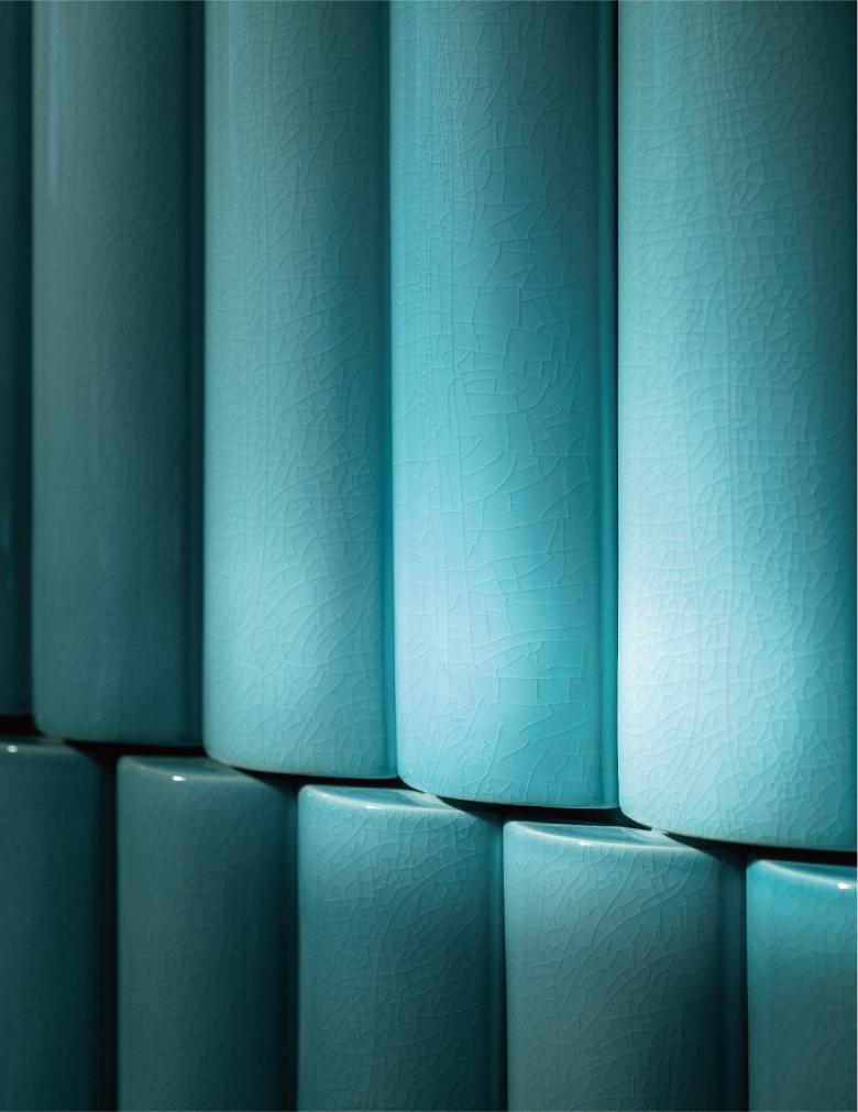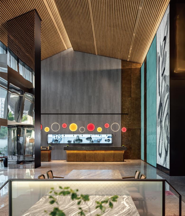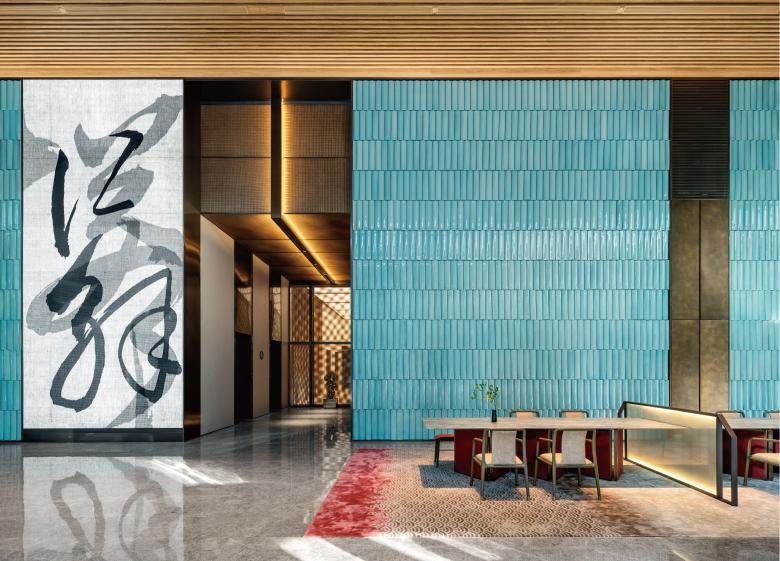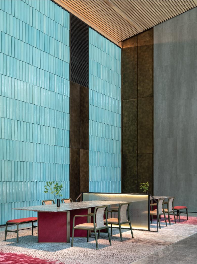In Joya Hotel Shanghai Gubei SOHO, we create the lobby with a void above, the welcome space led the guests into the quiet sense. Large areas of celadon glazed tiles evoke memories of the elegant and delicate Song Dynasty Ru porcelain.