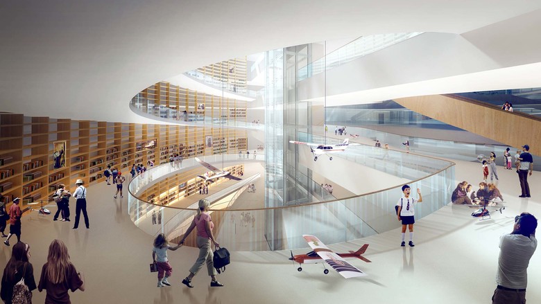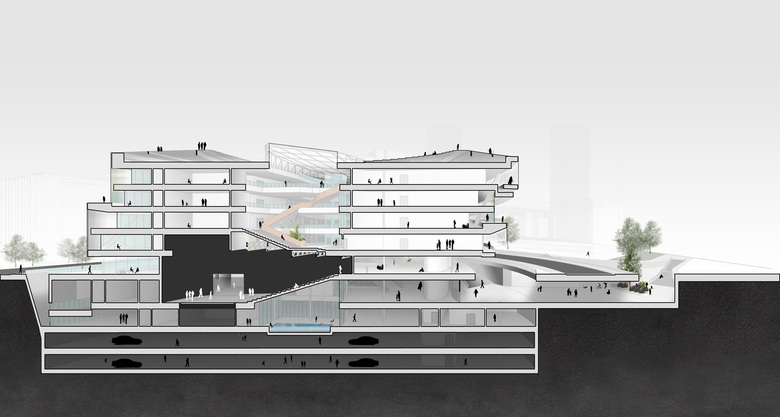 The building was wrapped by a continues ramp which connects inside and outside spaces, lower and higher spaces, public and private spaces. With view towards the open green space, this exterior ramp also became the dominant feature of the building appearance. There is a second ramp inside the building running from basement all the way to the rooftop providing seamless and friendly connection though the entitle building floors. The inner ramp was designed with a generous width of four meters and equipped with a full height book shelve where various activities are encouraged to take place, such as exhibition, reading, etc,.