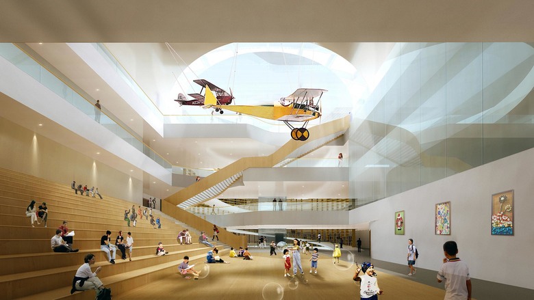 The building interior also features a square atrium that connects the levels above the theatre with sculpture-form like staircases, the open grand stair on the second floor makes this open space the interactive center of the Youth Palace.
