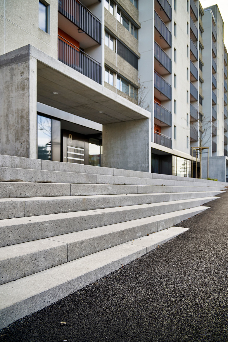 Das Scheibenhochhaus mit 54 Wohnungen an der Mühledorfstrasse bildet den nördlichen Abschluss des Fellerguts, einer Grossüberbauung aus den 1970er-Jahren. Gezielte Eingriffe in den Sockelgeschossen verändern die Orientierung des ganzen Gebäudes: aus der vernachlässigten Rückfassade wird neu eine attraktive und lebendige Zugangsfassade.