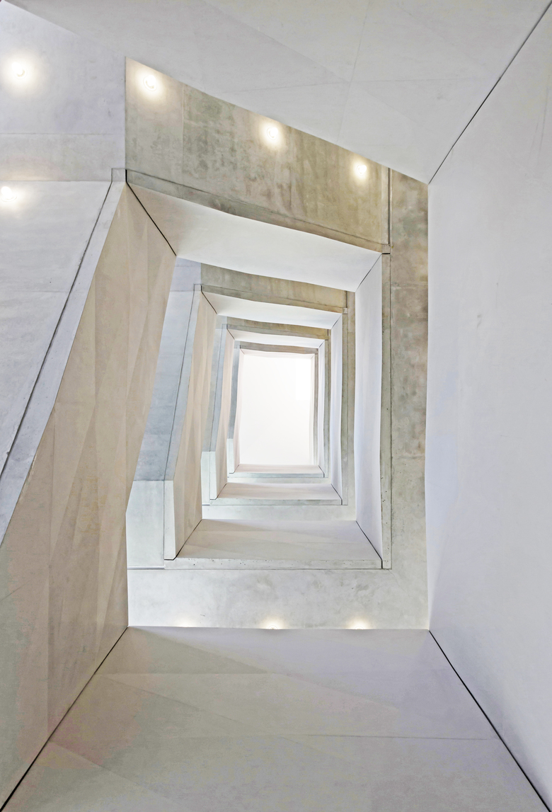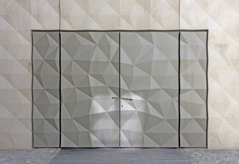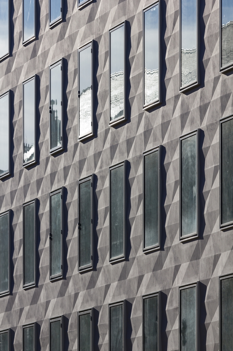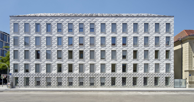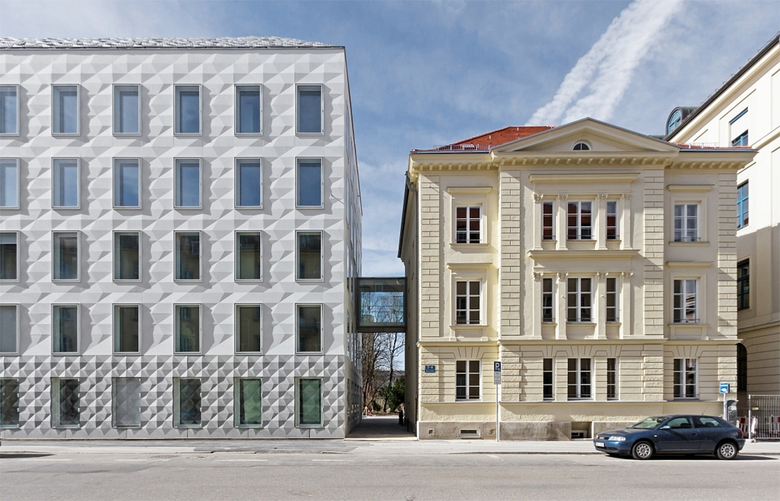 Der Entwurf des Gebäudes spielt mit der Interferenz zwischen Alt und Neu als Baustein in dem historischen Umfeld der Münchener Maxvorstadt einerseits, sowie als zukunftsgerichteter Schlussstein des Gebäudeensembles einer bedeutenden Institution wie der Evangelischen Kirche andererseits. Das Aufnehmen und die Transformation von kontextuellen Elementen ist dabei der tragende Leitgedanke. Auf den ersten Blick ein scheinbar traditioneller Baukörper mit einer tektonischen Lochfassade und der Dreigliederung mit Sockel und geneigtem Dach. In der Annäherung auf den zweiten Blick erschließt sich dem Betrachter der Paradigmenwechsel der einzelnen Bauteile hin zu einem zeitgenössischen eigenständigen Haus, gegliedert durch eine polygonale Prägung, die die ganze Hülle strukturiert. Beginnend mit dem geschosshohen Fertigteilsockel als robuste durchgängige Basis. Darüber die Strukturierung der polygonal gefrästen Fassade mit dem Charakter einer Putzfassade und abschließend das Dach als perforiertes, gitterartiges Faltwerk das die Struktur der Fassade weiterspielt den durchscheinenden Rahmen für den großen Saal und den großzügigen Dachgarten bildet.
