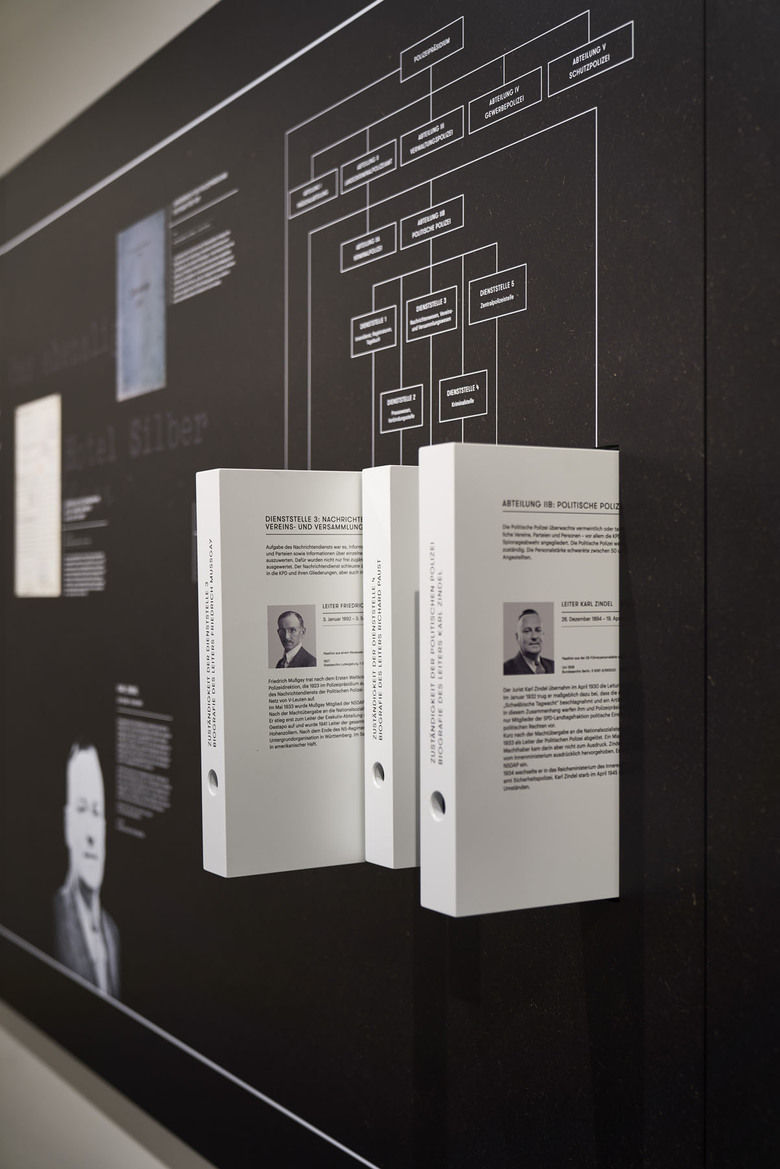 Orientiert wird der Besucher durch ein mattschwarzes Band an der Wand, dass die chronologische Entwicklung der In¬stitution und Staatsmacht Polizei darstellt.