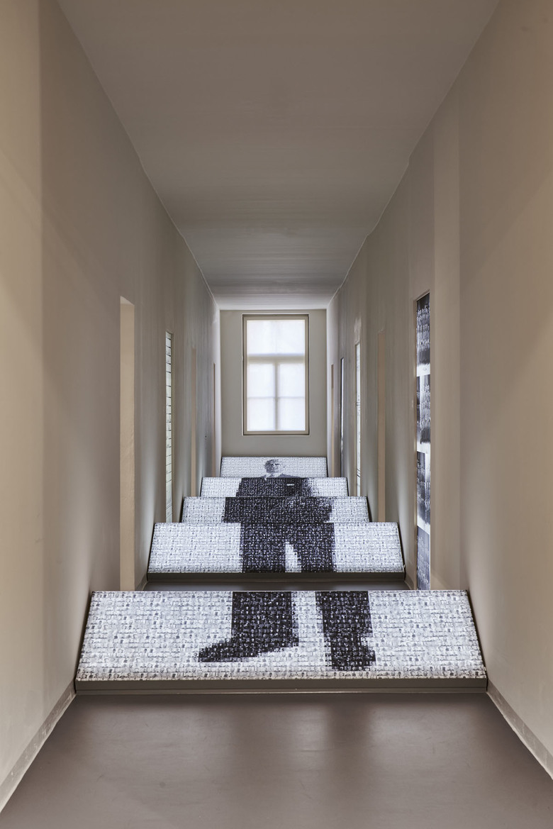 Im Flur des ersten Obergeschosses steht der Besucher zunächst den Tätern gegenüber, zusammengesetzt wird dieser Eindruck aus Portraitfotos auf leuchtkastenartigen Aufstellern, die die lange Flurzone nur selektiv begehbar machen.