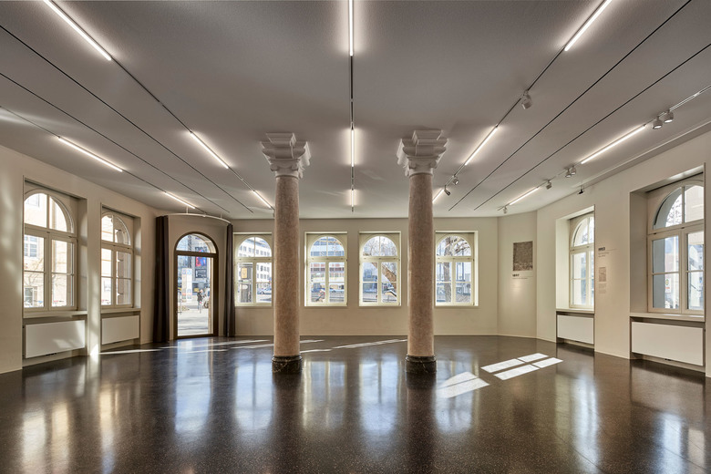 Anstelle des verlorenen Eckturmes verdeutlicht eine abstrahierte Nachbildung des Erkers als bedrucktes Zeichen die neue Nutzung und schwebt über dem wiederhergestellten Haupteingang des einstigen Restaurants. Als Schnittstelle zur Öffentlichkeit gelangt man hier auf direktem Wege in den „Wechselraum“- früher Frühstücksraum und Restaurant des Hotels - der im alltäglichen Betrieb großzügiges Foyer mit Ticketing ist. In seiner zweiten Funktion ist der „Wechselraum“ ein Veranstaltungsort für Vorträge, Podiumsdiskussionen und andere Formate, zwei ergänzende Seminarräume im Erdgeschoss dienen der Wissensvermittlung. Die Servicebereiche liegen im Untergeschoss, wo auch die ehemaligen Verwahrzellen noch zu sehen sind und einen Eindruck der ursprünglichen Enge der Zellenräume geben.