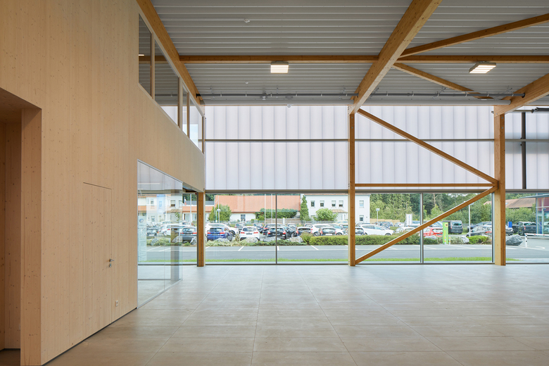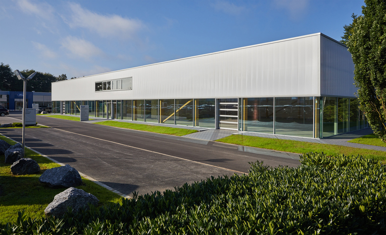 Der Neubau steht an einen kleinen Wald angrenzend im hinteren Teil des Betriebsgrundstücks. Er liegt hinter der großen Außenaufstellfläche für Fahrzeuge und fällt daher speziell in den Abendstunden nicht unmittelbar ins Auge. Um dieses Manko zu kompensieren, wurde die Fassade des Gebäudes zur Bundesstraße und zur Erschließungsstraße hin durch die Verwendung von Glas und Polycarbonat mit einer transparenten bzw. transluzenten Außenhaut ausgestattet, welche die neue Fahrzeughalle während der dunklen Tageszeiten erleuchten lässt und so die Aufmerksamkeit der Passanten weckt. Auf der Rückseite ist die untere Hälfte der Fassade mit einem strukturierten Beton verkleidet, der hier einen spannungsvollen Kontrast zur glatten Polycarbonathülle des oberen Bereichs bildet.