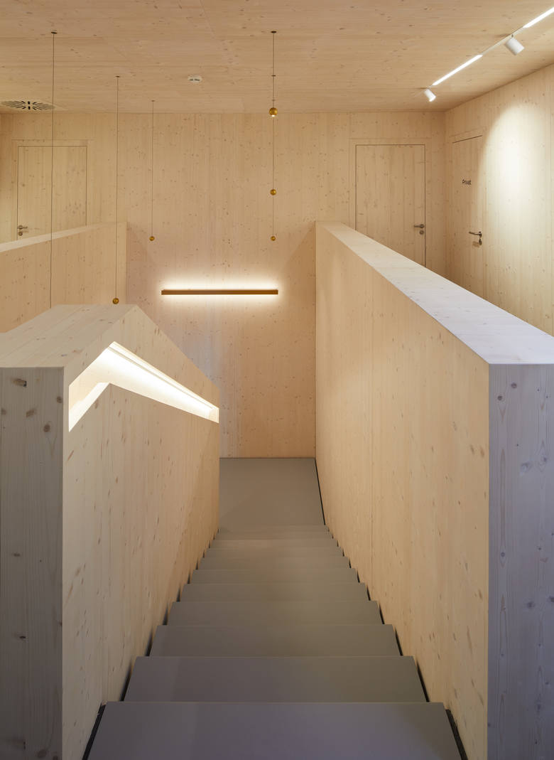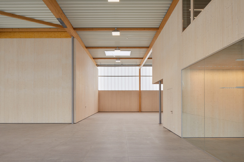 Neben der Ausstellungsfläche für die Autos wünschte der Bauherr zudem eine kleine Werkstatt, zwei Verkäuferbüros, eine Bar, einen großen Besprechungsraum und einen Raum zum Zurückziehen. Erstere wurde aus funktionalen Gründen in der südwestlichen Ecke des Gebäudes, direkt gegenüber der Werkstatt des Altbaus angeordnet. Die anderen Funktionen sind in einem ganz in Holz gehaltenen zweigeschossigen Baukörper untergebracht, der als Haus-im-Haus in die Mitte der Halle gestellt wurde. Seine Lage und seine Geometrie unterteilt die Fahrzeughalle im Zusammenspiel mit der Werkstatt in Bereiche unterschiedlicher Proportionen: mal groß und geräumig, mal klein und intim. Diese unterschiedlichen räumlichen Qualitäten ergeben eine spannungsvolle Abfolge von Räumen, welche die sinnliche Erfahrung beim Durchschreiten der neuen Fahrzeughalle bereichern. Die im Obergeschoss untergebrachten Aufenthaltsräume sind mit Fenstern zur Halle ausgestattet, welche Blickbeziehungen zwischen den verschiedenen Funktionsbereichen ermöglichen.