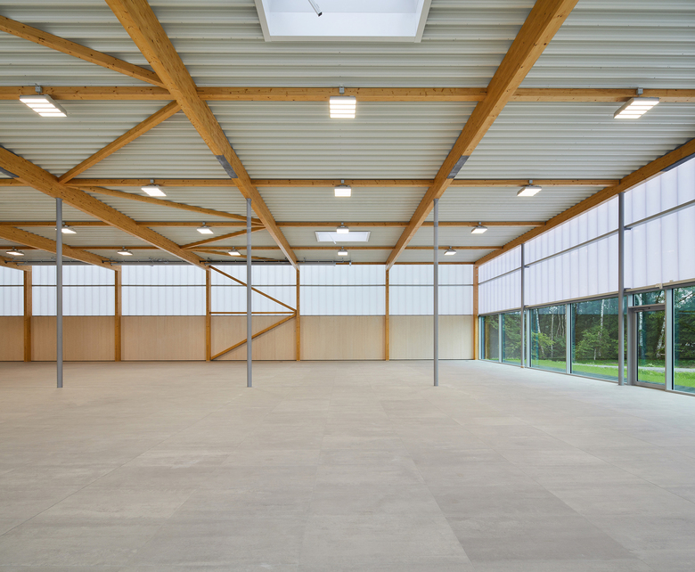 Am Rande der ostwestfälischen Stadt Halle hat das Autohaus Ford Hagemeier mit dem Bau einer neuen Fahrzeughalle einen großen Schritt in Richtung Expansion gemacht. Mit der Verdreifachung der Ausstellungsfläche besteht nun die Möglichkeit, neben Nutzfahrzeugen auch die PKW der Ford-Produktpalette zielgruppenorientiert zu präsentieren. Dabei wird die alte Fahrzeughalle zum Performance-Center, in dem die eher sportiv ausgerichteten Fahrzeuge ausgestellt werden. Der Neubau dagegen ist gedacht für auf Familien und ältere Menschen ausgerichtete Fahrzeuge, aber auch besondere Angebote für Schnäppchenjäger. Die unterschiedliche Kundenausrichtung der Gebäude sollte sich nach Wunsch des Bauherrn schon in deren Architektur wiederfinden. Daher wurde für die neue Fahrzeughalle, anders als beim eher technisch anmutenden, im Stile des Ford-Store-Konzepts 2001 errichteten Altbaus, mit der Verwendung von Holz eine warme Atmosphäre geschaffen, die besser der psychischen Konditionierung der definierten Zielgruppen zu entsprechen scheint.