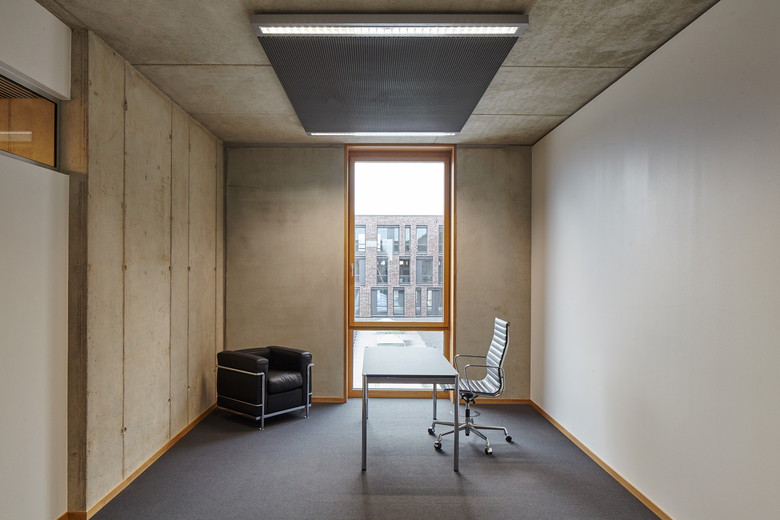 In diesem Zusammenhang steht auch der viergeschossige Neubau an der Stelle eines ehemaligen Autohauses, der mit einem Verbrauchermarkt im Erdgeschoss und darüber liegenden Büros für unterschiedliche Nutzer zur Belebung und städtebaulichen Aufwertung dieses Stadtviertels beitragen will. Der Zugang zum Markt liegt an der Westseite des Gebäudes, in direkter Nähe der Stellplätze. Die Erschließung der Büroetagen erfolgt über zwei Treppenhäuser, die jeweils an den Gebäudeecken entlang der Werner-Bock-Straße untergebracht sind. Die Bürogrundrisse wurden so organisiert, dass auf jeder Etage bis zu vier autarke Mieteinheiten geschaffen werden können.