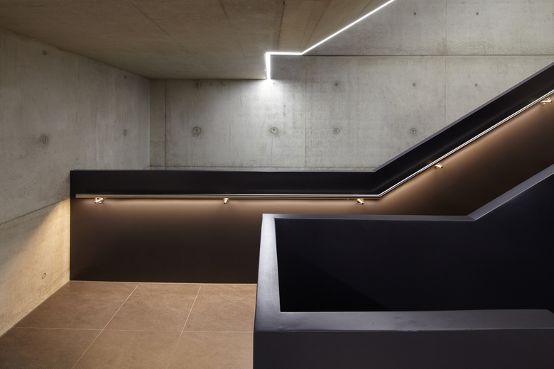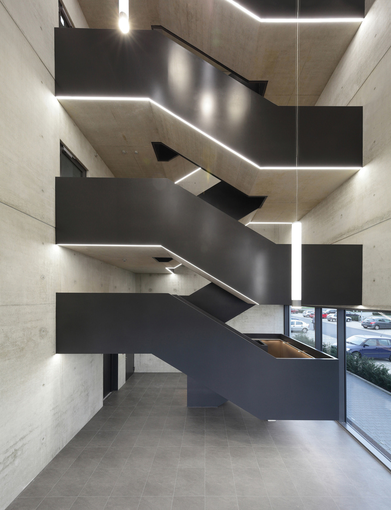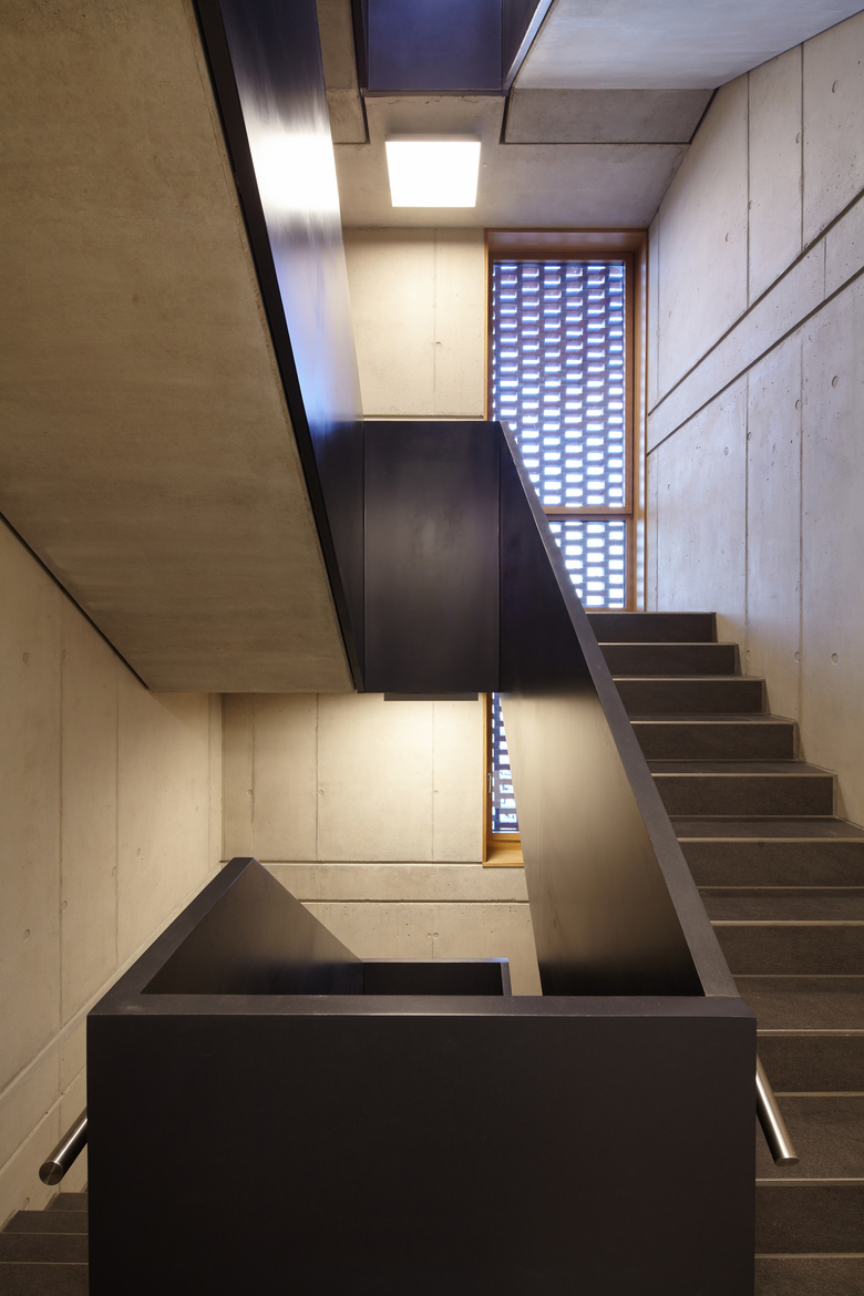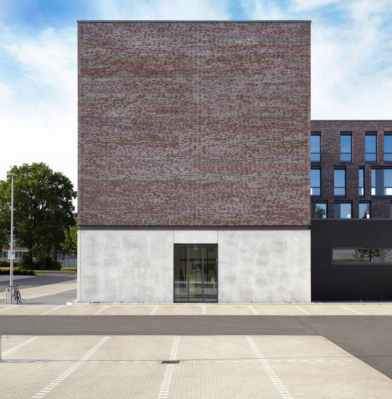 Die Fassade des Gebäudes ist unterteilt in eine Erdgeschosszone aus Sichtbeton und den darüber liegenden Geschossen aus gebranntem Klinker. Sie bildet damit die unterschiedlichen Funktionen auch nach außen hin ab. Mit der Wahl eines Klinkers nimmt das Gebäude Bezug auf die Geschichte des Ortes. Der ehemalige Schlachthof, die heute von der Fachhochschule genutzte frühere Kaserne, die Seidenstickerhalle sowie die Feuerwache, die sich in der näheren Umgebung befinden, sind allesamt Klinkerbauten, die das Quartier seit vielen Jahren prägen. Auch damit möchte das Gebäude einen Beitrag zur architektonischen Konsolidierung des Quartiers beitragen.