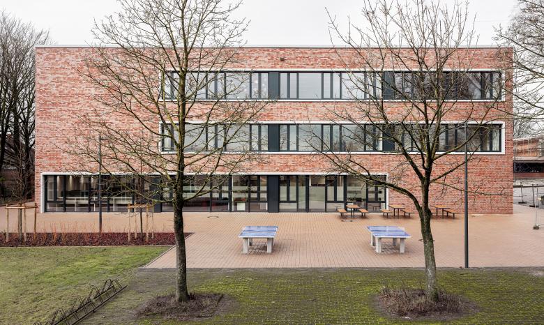 Die beiden Obergeschosse sind annähernd baugleich strukturiert. Jede Ebene verfügt über einen inneren Kern mit Toiletten, Putzmittelraum und Technik/ Server und außen liegenden Klassenräumen. Zahlreiche Öffnungen im Dach bringen reichlich Tageslicht in das Innere des Gebäudes und führen zu einer deutlichen Verbesserung der Aufenthaltsqualität der zentralen Bereiche.