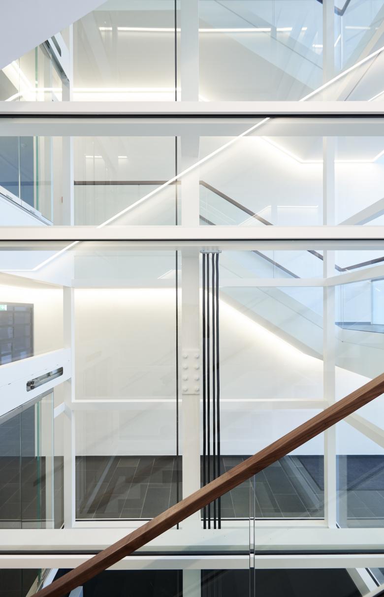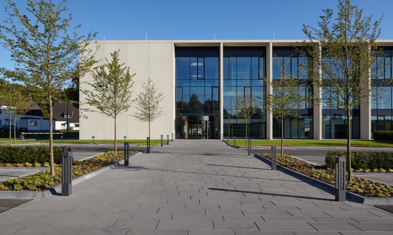 Das Schulungszentrum präsentiert sich zur Straße und zum Parkplatz als weitgehend transparentes Bauwerk. Es gewährt spannende Einblicke in die Ausstellungsbereiche und wird zudem großzügig mit natürlichem Licht versorgt. Die sandgestrahlten Sichtbetonoberflächen nehmen Bezug auf die Fassade der 1990 errichteten Unternehmenszentrale und dokumentieren die Zugehörigkeit des Schulungszentrums zum auf der anderen Seite der Straße angesiedelten Unternehmen.