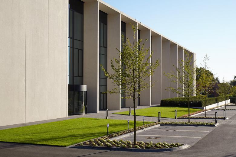 Als Standort wurde ein vom Unternehmen bislang als Mitarbeiterparkplatz genutztes Grundstück unmittelbar gegenüber des Firmensitzes ausgewählt. Der dreigeschossige längliche Baukörper wurde nah an die Gemeindestraße gelegt, um hinter dem Gebäude noch möglichst viele Stellplätze für Besucher des Schulungszentrums unterbringen zu können.