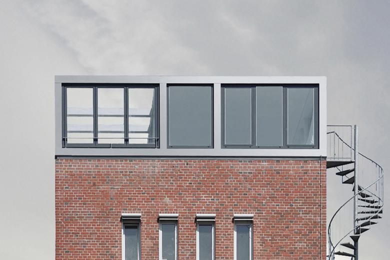 Da der Bedarf nach zusätzlichen Räumen nicht allein durch Veränderungen im Grundriss befriedigt werden konnte, wurde der Turm um eine Etage aufgestockt. Das neue Geschoss setzt sich architektonisch bewusst vom Bestand ab. Der transparente Körper aus Glas und Aluminium bildet einen Kontrast zur Lochfassade der historischen Backsteinarchitektur. Eine kleine Schattenfuge trennt die Aufstockung vom Bestand. Durch das Aufgreifen vorhandener Farben werden Bezüge zum Bestehenden hergestellt und die architektonische Integration erleichtert.